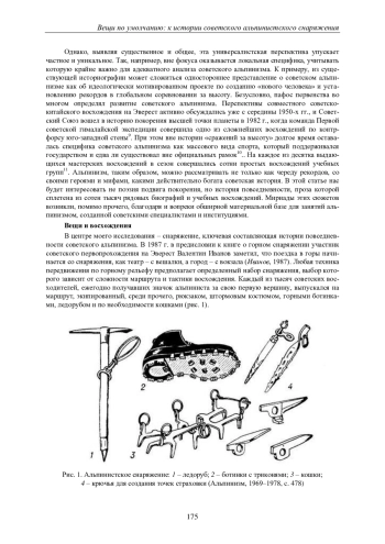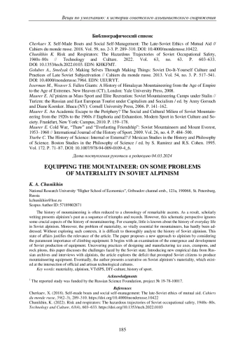 История альпинизма нередко редуцируется до хронологии выдающихся восхождений. При подобном подходе прошлое понимается в рамках логики триумфа. Однако подобная сухая перспектива оставляет вне фокуса важные аспекты истории горовосхождений. Например, история повседневности альпинизма изучена фрагментарно, а важнейшая для этого вида спорта проблематика материальности и вовсе едва ли поднималась. Без учета этих контекстов невозможно понять специфику советского альпинизма. Эта ситуация и определяет актуальность настоящей статьи. Исследование посвящено снаряжению, история которого до сих пор оставалась умолчанием, несмотря на всю первостепенную важность экипировки для восхождений. Опираясь на неопубликованные материалы из архивов советских институций, отвечавших за развитие альпинизма и производство снаряжения, в этой статье предлагается новый взгляд на историю этой спортивной дисциплины. Статья начинается с обзора этапов развития и становления изготовления альпинистской экипировки в СССР. При этом особое внимание уделяется тем проблемам, которые вставали перед советским государством в связи с необходимостью снабдить альпинистов качественным снаряжением, обеспечивающим безопасность восхождений. Другой острой проблемой стало производство в достаточном количестве, которое так и не удалось наладить в СССР. Дефицит экипировки побуждал советских граждан производить самодельные ледорубы, кошки и скальные крючья. В конце концов, в статье показывается, как производство снаряжения в СССР разворачивалось на стыке официальной и кустарной технологических культур. Эта статья не только заполняет лакуну в знании о советском альпинизме, но и является апробацией нового способа изучения многомерной истории этой дисциплины.