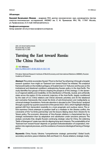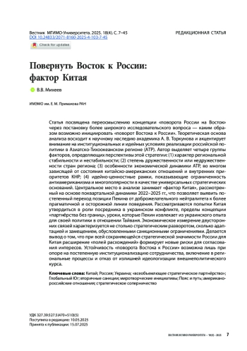 Статья посвящена переосмыслению концепции «поворота России на Восток» через постановку более широкого исследовательского вопроса — каким образом возможно инициировать «поворот Востока к России». Теоретическая основа анализа восходит к научному наследию академика А. В. Торкунова и акцентирует внимание на институциональных и идейных условиях реализации российской политики в Азиатско-Тихоокеанском регионе (АТР). Автор выделяет четыре группы факторов, определяющих перспективы этой стратегии: (1) характер региональной стабильности и нестабильности; (2) степень дружественности или недружественности стран региона; (3) особенности экономической динамики АТР, во многом зависящей от состояния китайско-американских отношений и внутренних приоритетов КНР; (4) идейно-ценностные рамки, показывающие ограниченность антиамериканизма и многополярности в качестве универсальных стратегических оснований. Центральное место в анализе занимает «фактор Китая», рассмотренный на основе поквартальной динамики 2022–2025 гг., что позволяет выявить постепенный переход позиции Пекина от доброжелательного нейтралитета к более прагматичной и осторожной линии поведения. Рассматриваются попытки Китая утвердиться в роли посредника в украинском конфликте, пределы концепции «партнёрства без границ», уроки, которые Пекин извлекает из украинского опыта для своей политики в отношении Тайваня. Экономическое измерение двусторонних связей характеризуется не столько стратегическим разворотом, сколько адаптацией и замещением, обусловленными санкционными ограничениями. Делается вывод о том, что при всей сохраняющейся стратегической значимости России для Китая расширение «полей расхождений» формирует новые риски для согласования интересов. Устойчивость «поворота Востока к России» возможна лишь при опоре на постепенную институционализацию сотрудничества, включение в региональные процессы и отказ от излишней идеологизации внешнеполитического курса.