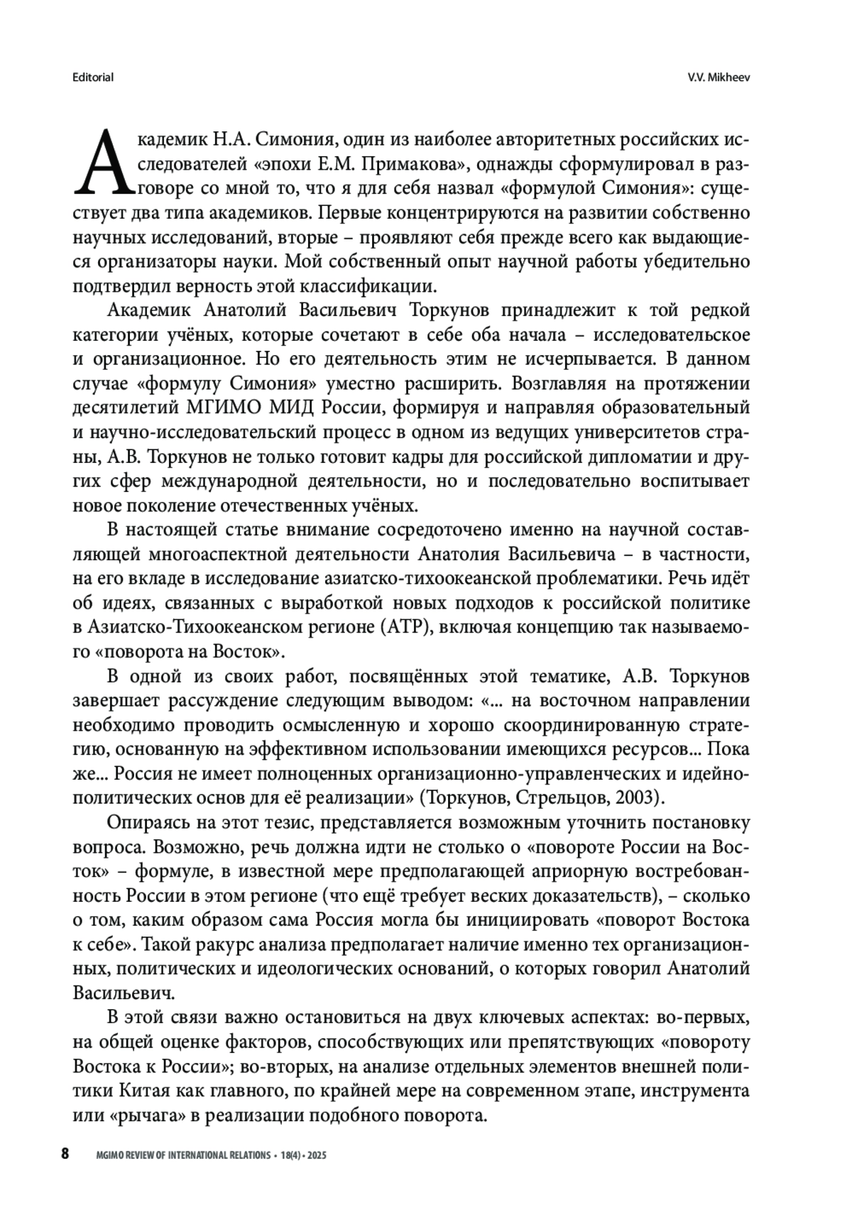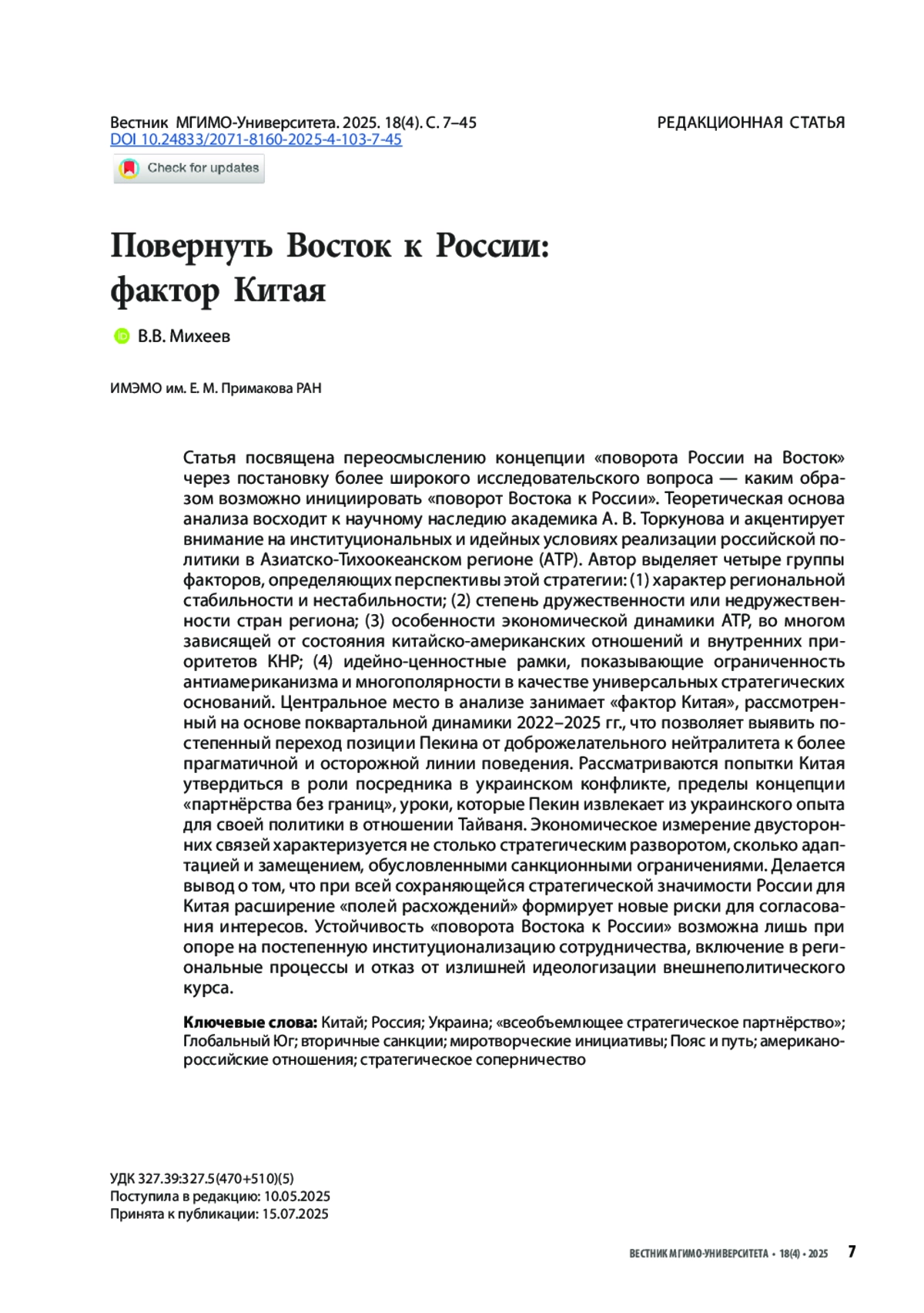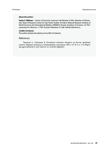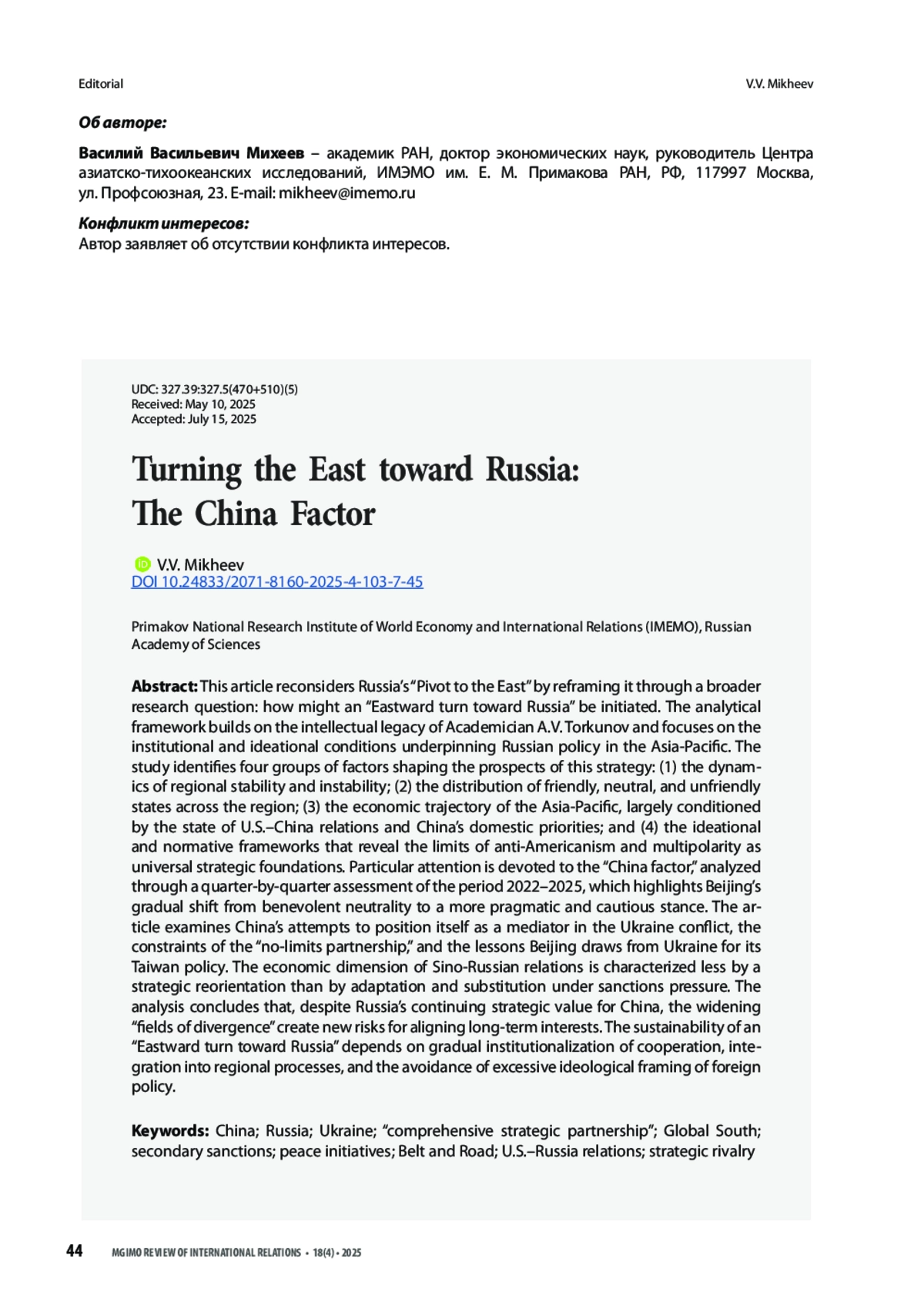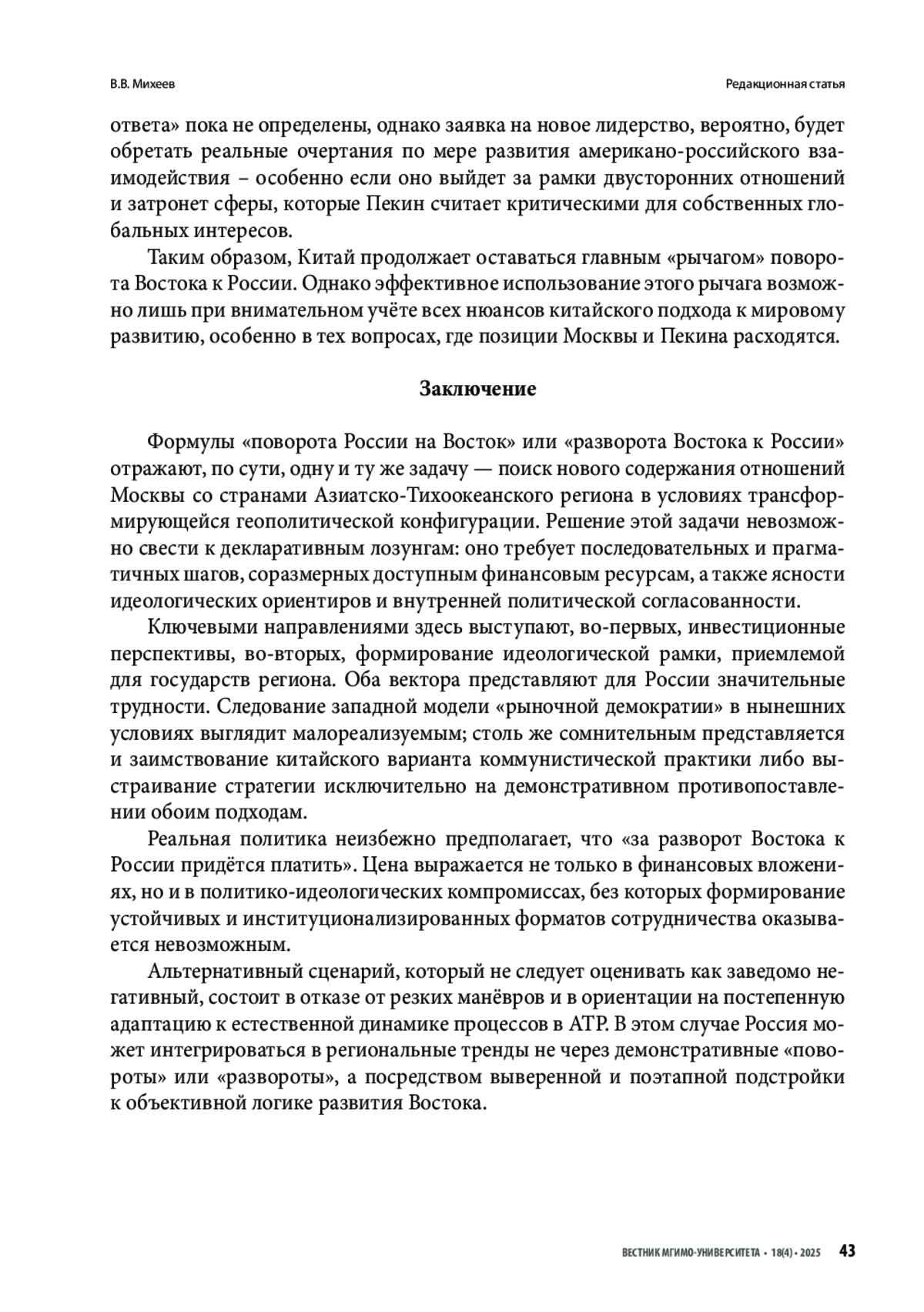 МИХЕЕВ В. В. ПОВЕРНУТЬ ВОСТОК К РОССИИ: ФАКТОР КИТАЯ // ВЕСТНИК МГИМО-УНИВЕРСИТЕТА. 2025. ТОМ 18, № 4