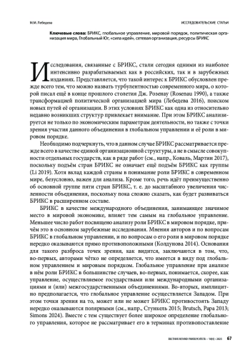 Ключевые фразы: БРИКС, глобальное управление, мировой порядок, политическая организация мира, Глобальный Юг, «сила идей», сетевая организация, ресурсы брикс