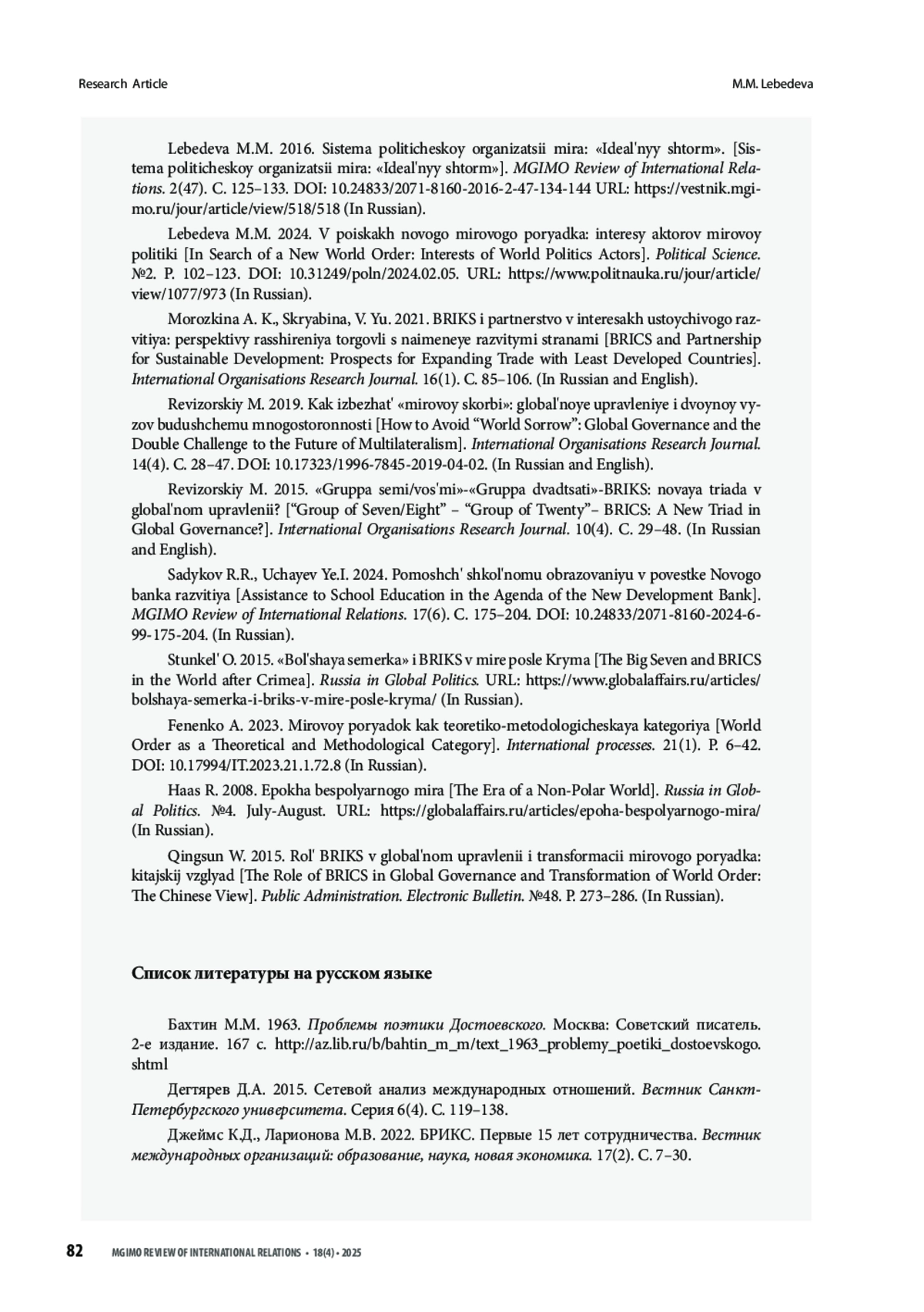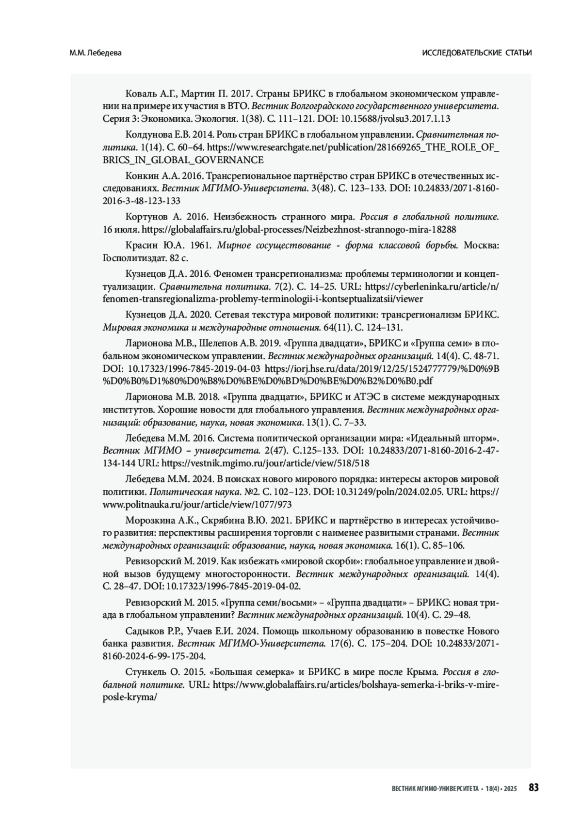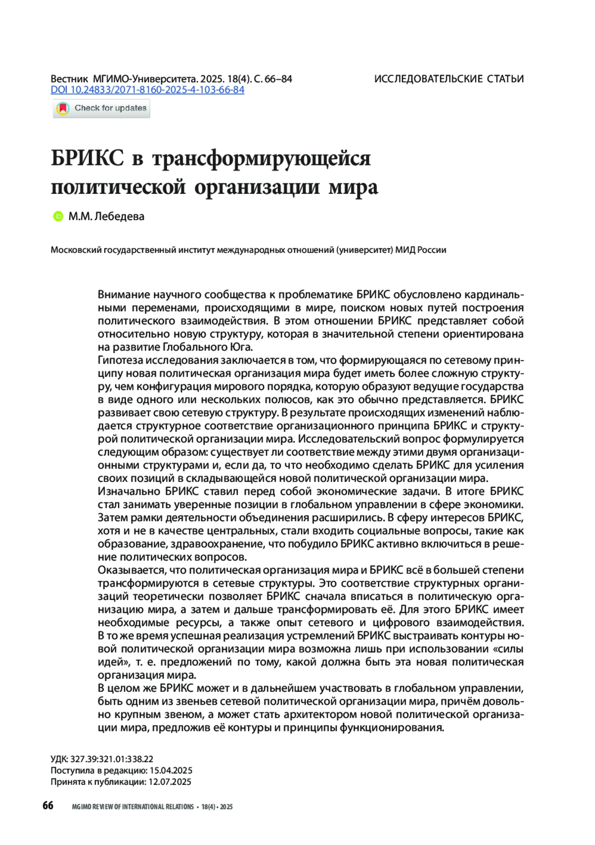 ЛЕБЕДЕВА М. М. БРИКС В ТРАНСФОРМИРУЮЩЕЙСЯ ПОЛИТИЧЕСКОЙ ОРГАНИЗАЦИИ МИРА // ВЕСТНИК МГИМО-УНИВЕРСИТЕТА. 2025. ТОМ 18, № 4