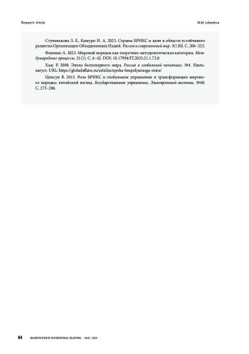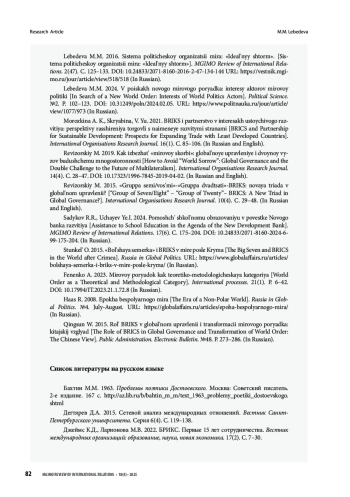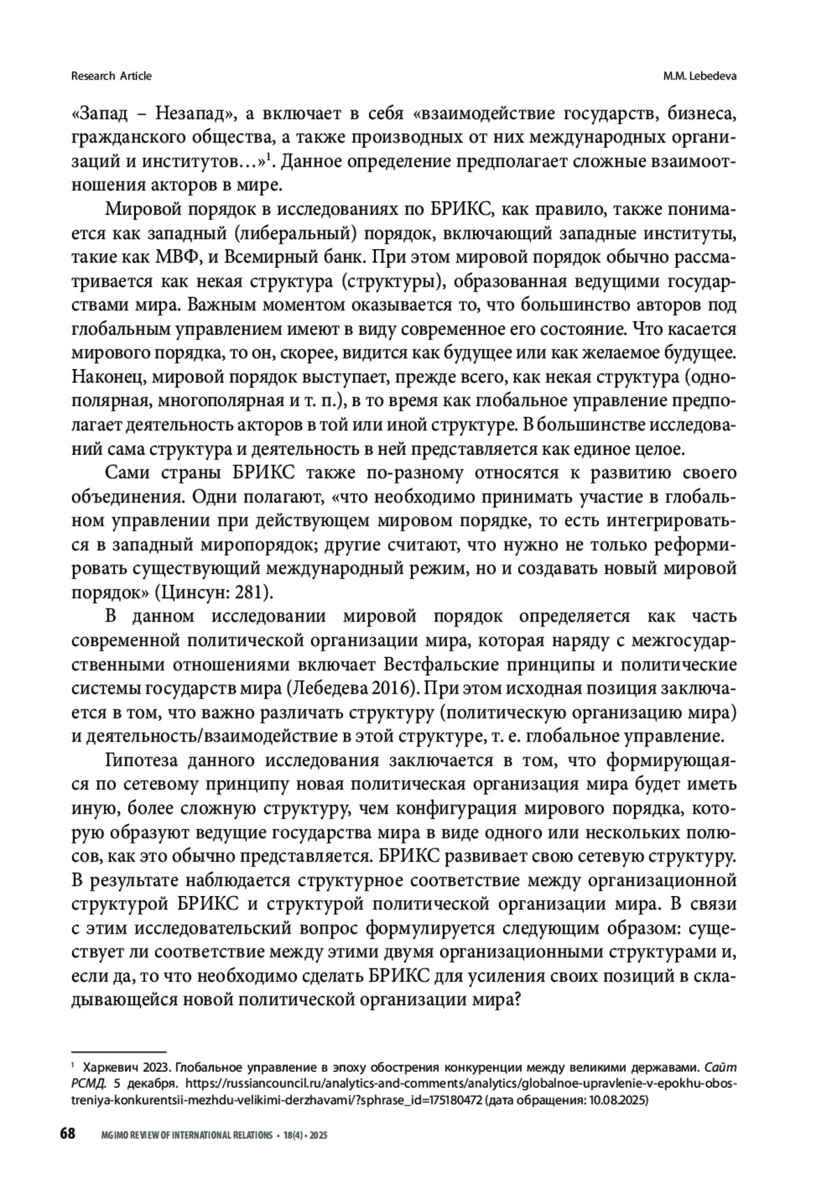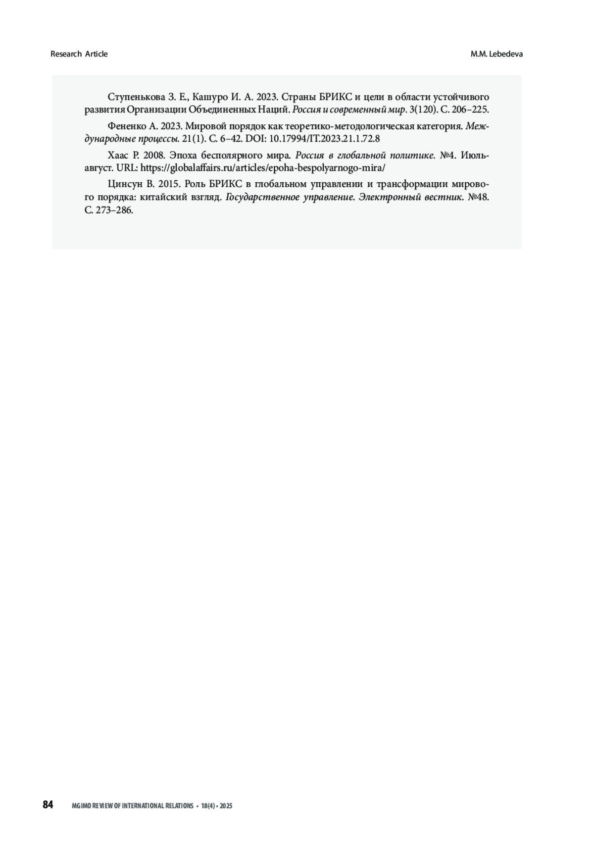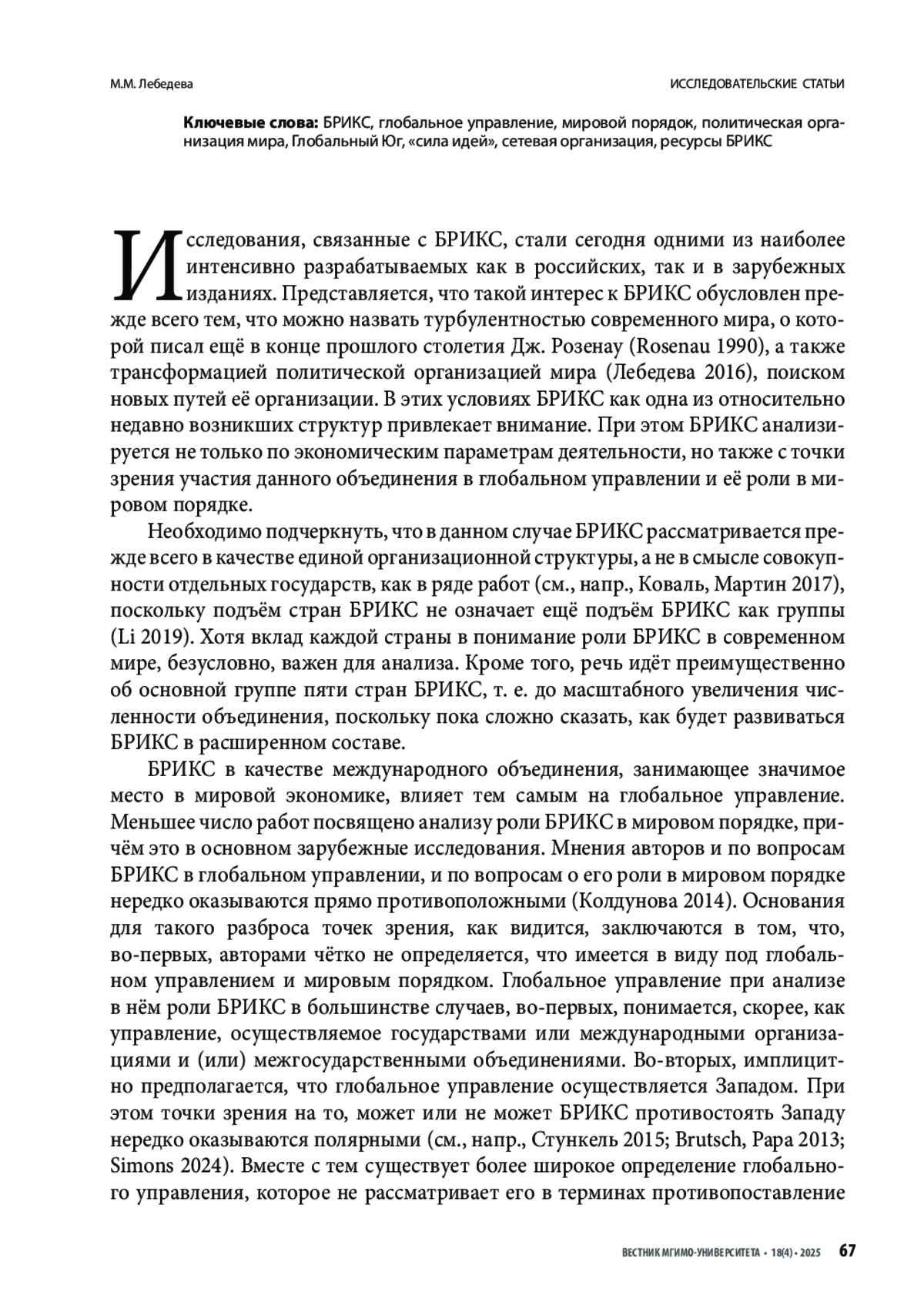 ЛЕБЕДЕВА М. М. БРИКС В ТРАНСФОРМИРУЮЩЕЙСЯ ПОЛИТИЧЕСКОЙ ОРГАНИЗАЦИИ МИРА // ВЕСТНИК МГИМО-УНИВЕРСИТЕТА. 2025. ТОМ 18, № 4