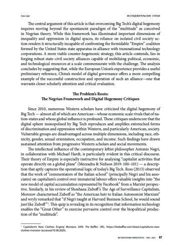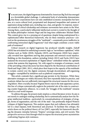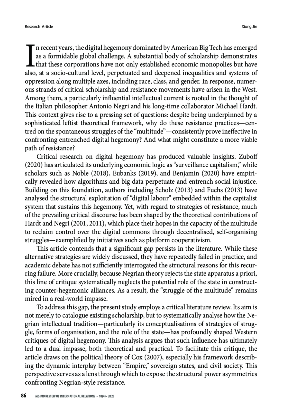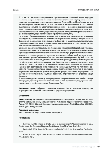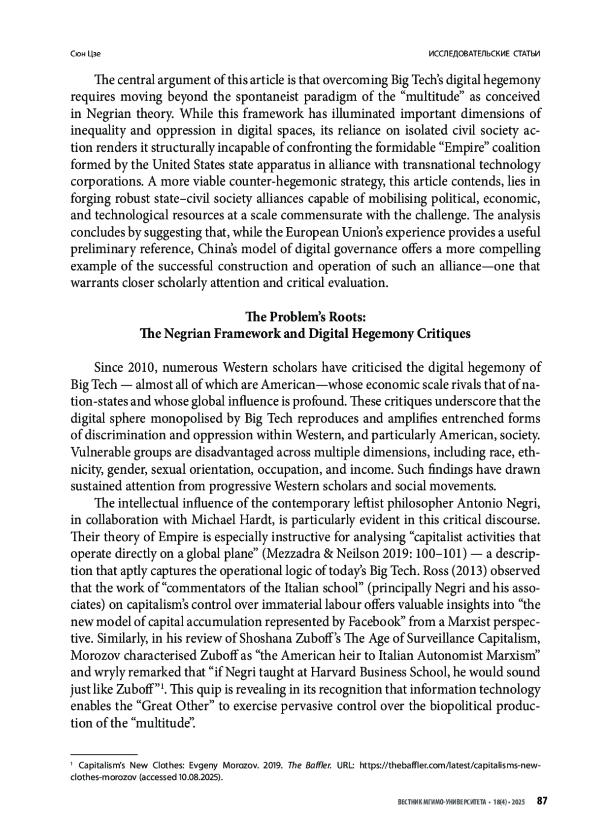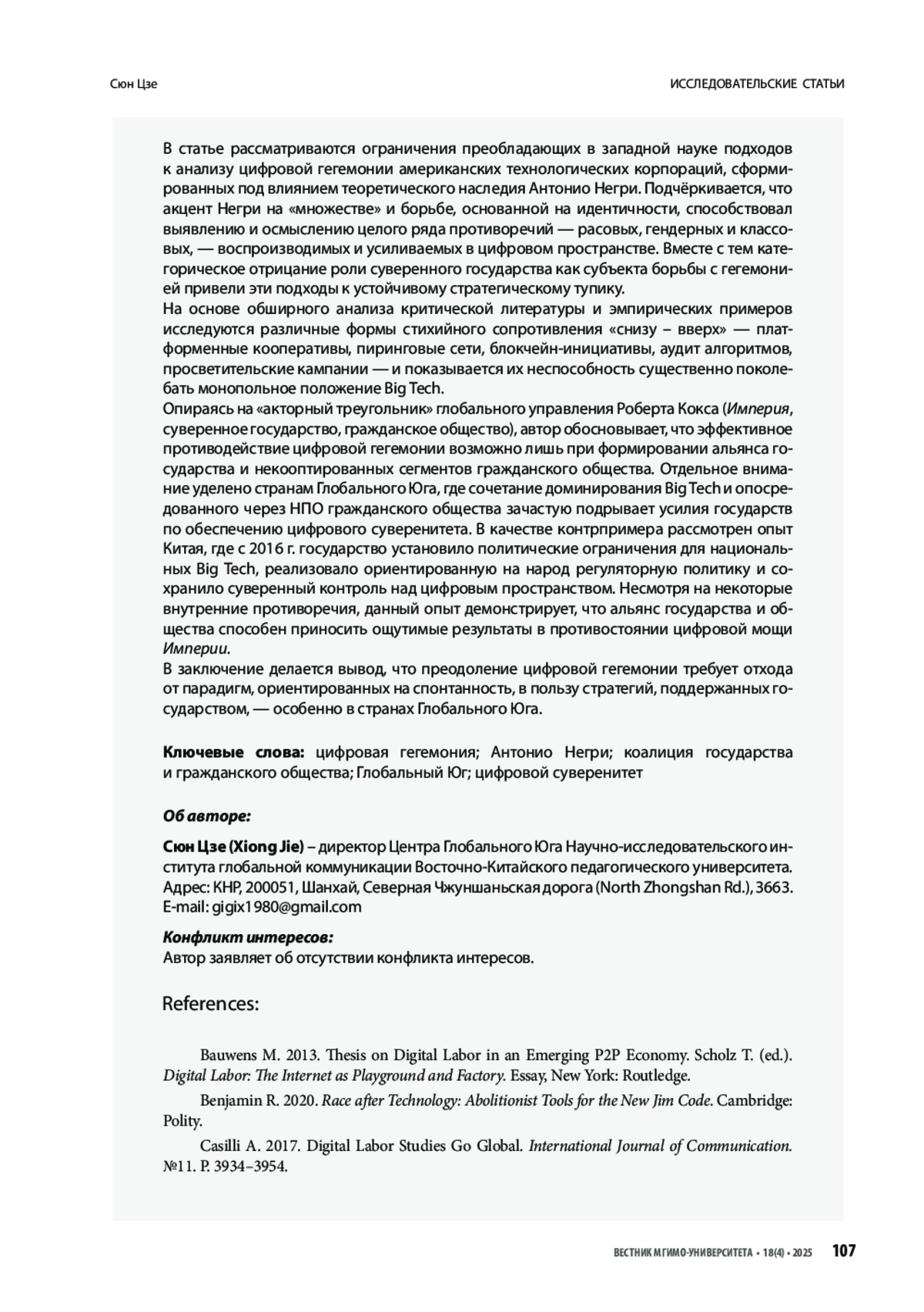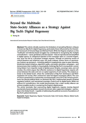 Подчёркивается, что акцент Негри на «множестве» и борьбе, основанной на идентичности, способствовал выявлению и осмыслению целого ряда противоречий — расовых, гендерных и классовых, — воспроизводимых и усиливаемых в цифровом пространстве. Вместе с тем категорическое отрицание роли суверенного государства как субъекта борьбы с гегемонией привели эти подходы к устойчивому стратегическому тупику. На основе обширного анализа критической литературы и эмпирических примеров исследуются различные формы стихийного сопротивления «снизу – вверх» — платформенные кооперативы, пиринговые сети, блокчейн-инициативы, аудит алгоритмов, просветительские кампании — и показывается их неспособность существенно поколебать монопольное положение Big Tech. Опираясь на «акторный треугольник» глобального управления Роберта Кокса (Империя, суверенное государство, гражданское общество), автор обосновывает, что эффективное противодействие цифровой гегемонии возможно лишь при формировании альянса государства и некооптированных сегментов гражданского общества. Отдельное внимание уделено странам Глобального Юга, где сочетание доминирования Big Tech и опосредованного через НПО гражданского общества зачастую подрывает усилия государств по обеспечению цифрового суверенитета. В качестве контрпримера рассмотрен опыт Китая, где с 2016 г. государство установило политические ограничения для национальных Big Tech, реализовало ориентированную на народ регуляторную политику и сохранило суверенный контроль над цифровым пространством. Несмотря на некоторые внутренние противоречия, данный опыт демонстрирует, что альянс государства и общества способен приносить ощутимые результаты в противостоянии цифровой мощи Империи.