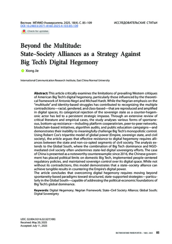 ЦЗЕ С. ПРЕОДОЛЕВАЯ ОГРАНИЧЕНИЯ «МНОЖЕСТВА»: СОЮЗ ГОСУДАРСТВА И ОБЩЕСТВА ПРОТИВ ЦИФРОВОЙ ГЕГЕМОНИИ ТЕХНОГИГАНТОВ // ВЕСТНИК МГИМО-УНИВЕРСИТЕТА. 2025. ТОМ 18, № 4