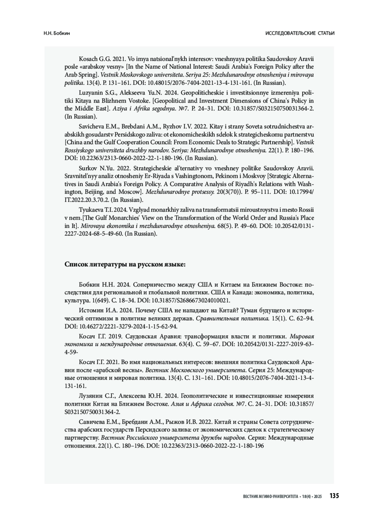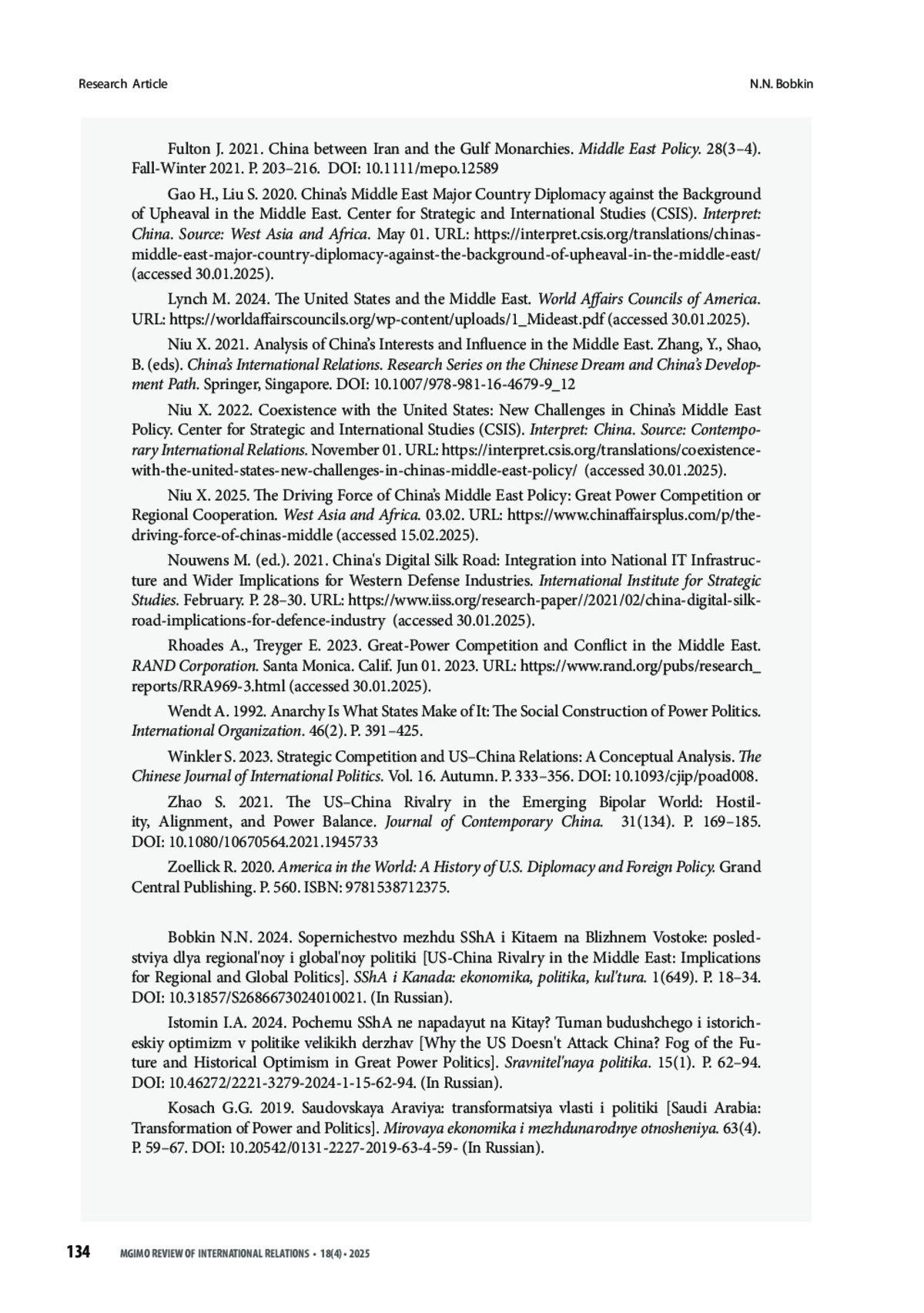 19. Бобкин Н.Н. 2024. Соперничество между США и Китаем на Ближнем Востоке: последствия для региональной и глобальной политики. США и Канада: экономика, политика, культура. 1(649). С. 18-34. https://doi.org/10.31857/S2686673024010021.