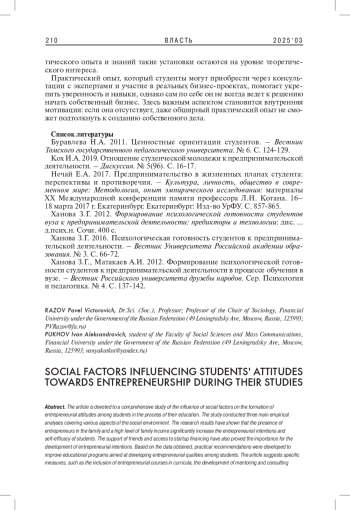 Статья посвящена всестороннему исследованию влияния социальных факторов на формирование предпринимательских установок у студентов в процессе их обучения. В рамках исследования проведены три основных эмпирических анализа, охватывающих различные аспекты социальной среды. Результаты исследований показали, что наличие предпринимателей в семье и высокий уровень семейного дохода значительно повышают предпринимательские намерения и самоэффективность студентов. Поддержка друзей и доступ к финансированию стартапов также оказались важными для развития предпринимательских намерений. На основе полученных данных были разработаны практические рекомендации по улучшению образовательных программ, направленных на развитие предпринимательских качеств у студентов. В статье предлагаются конкретные меры, такие как включение предпринимательских курсов в учебные программы, развитие систем менторства и консультирования, а также создание благоприятной предпринимательской среды в вузах. Заключительная часть статьи обсуждает перспективы дальнейших исследований, включая изучение долгосрочных эффектов предпринимательского образования, влияние цифровых технологий и культурные различия в предпринимательской активности. Эти направления исследований помогут глубже понять механизмы формирования предпринимательских установок и разработать более эффективные образовательные стратегии для будущих предпринимателей.