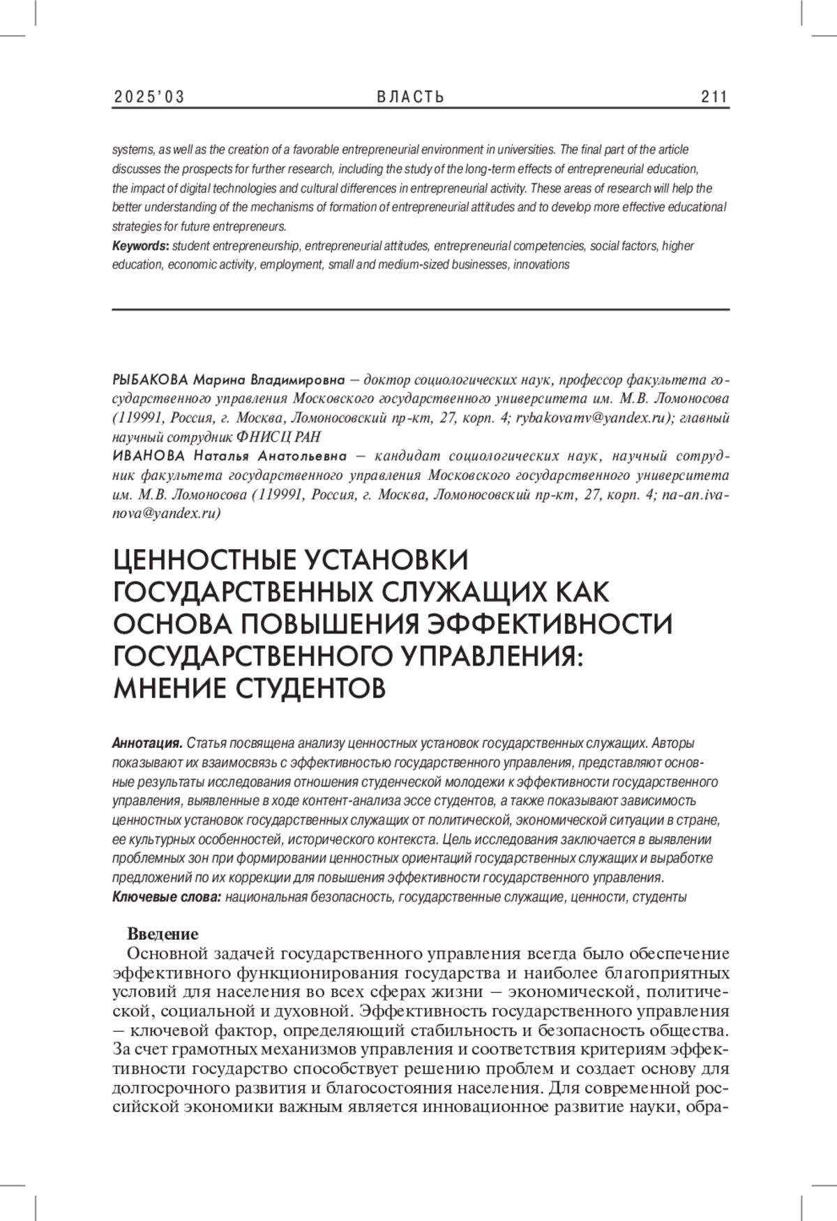 Статья посвящена анализу ценностных установок государственных служащих. Авторы показывают их взаимосвязь с эффективностью государственного управления, представляют основные результаты исследования отношения студенческой молодежи к эффективности государственного управления, выявленные в ходе контент-анализа эссе студентов, а также показывают зависимость ценностных установок государственных служащих от политической, экономической ситуации в стране, ее культурных особенностей, исторического контекста. Цель исследования заключается в выявлении проблемных зон при формировании ценностных ориентаций государственных служащих и выработке предложений по их коррекции для повышения эффективности государственного управления.
