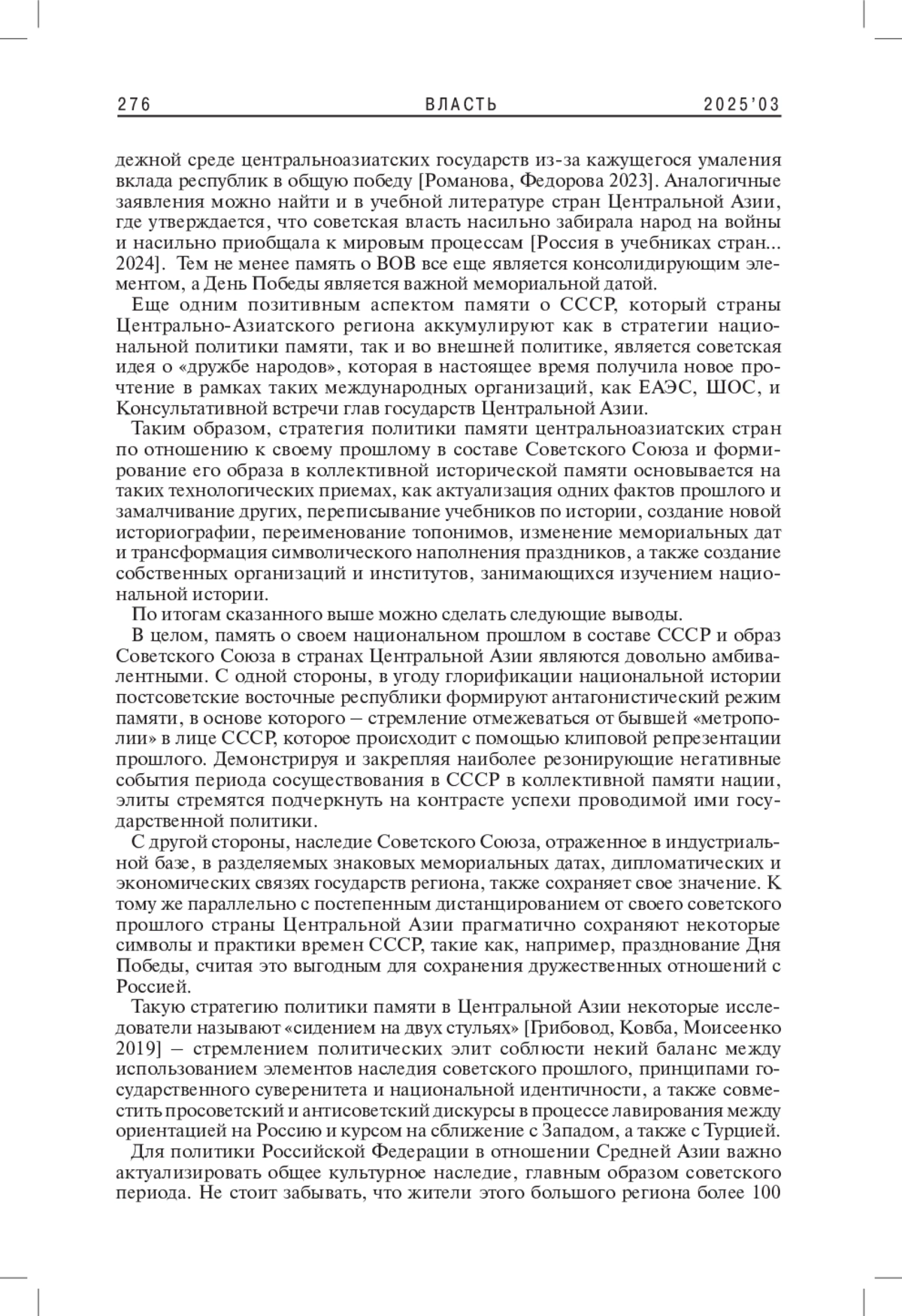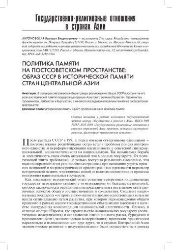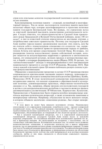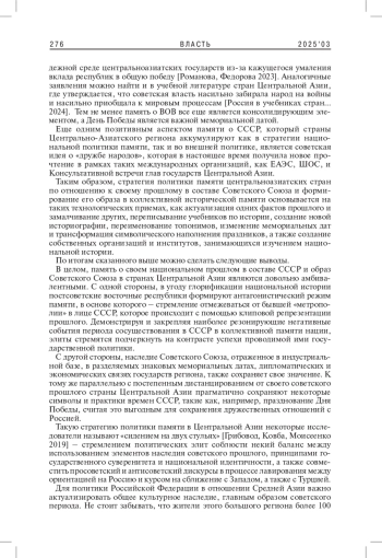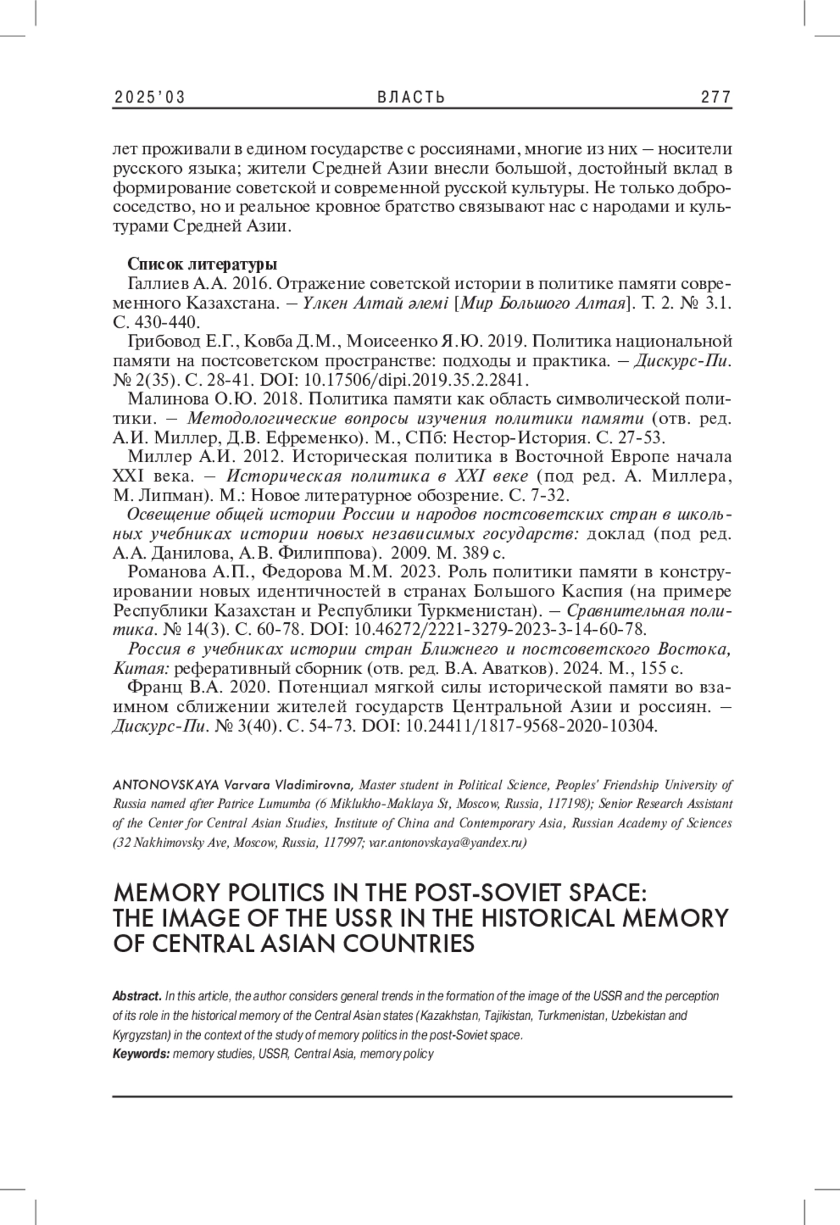 АНТОНОВСКАЯ В. В. ПОЛИТИКА ПАМЯТИ НА ПОСТСОВЕТСКОМ ПРОСТРАНСТВЕ: ОБРАЗ СССР В ИСТОРИЧЕСКОЙ ПАМЯТИ СТРАН ЦЕНТРАЛЬНОЙ АЗИИ // ВЛАСТЬ. 2025. ТОМ 33 № 3