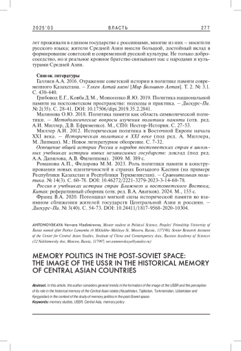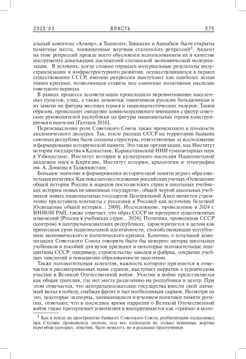 Статья: ПОЛИТИКА ПАМЯТИ НА ПОСТСОВЕТСКОМ ПРОСТРАНСТВЕ: ОБРАЗ СССР В ИСТОРИЧЕСКОЙ ПАМЯТИ СТРАН ЦЕНТРАЛЬНОЙ АЗИИ (2025)