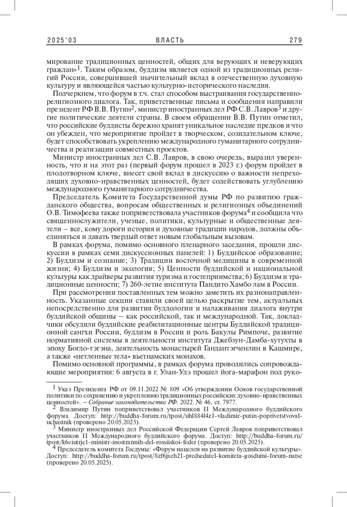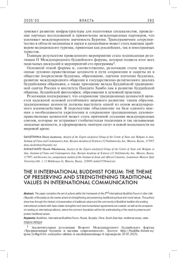 В статье рассматриваются мероприятия в рамках проведения II Международного буддийского форума в г. Улан-Удэ (Республика Бурятия) как события, целью которых является укрепление и сохранение традиционных духовно-нравственных ценностей. Вместе с тем авторы рассматривают, как через риторику сохранения традиционных ценностей и общность буддийской традиции укрепляются уже существующие международные контакты с государствами Азии и создаются новые гуманитарные соглашения, а также оценивают перспективы создания международного альянса, где общим фундаментом станет понимание необходимости сохранения и защиты традиционных ценностей.
