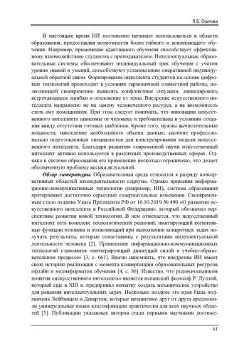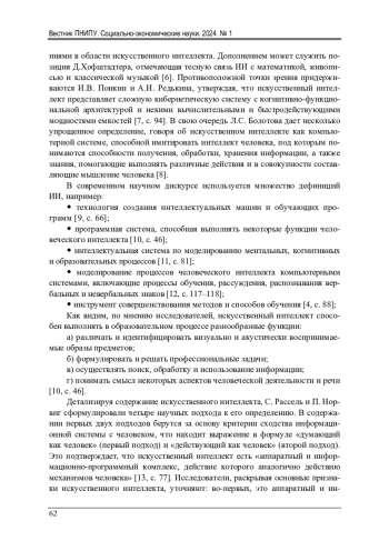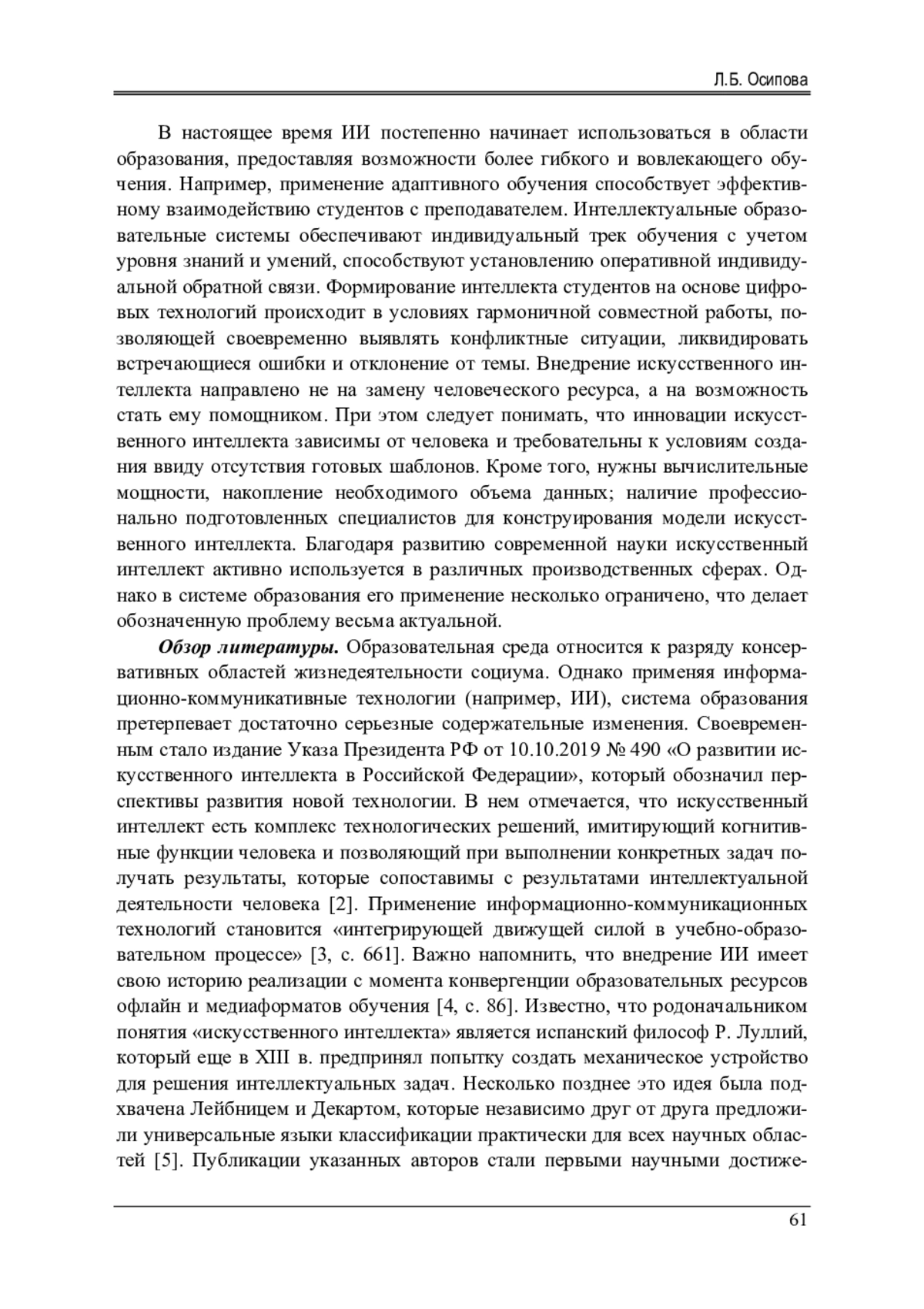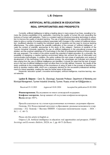 ОСИПОВА Л. Б. ИСКУССТВЕННЫЙ ИНТЕЛЛЕКТ В ОБРАЗОВАНИИ: РЕАЛЬНЫЕ ВОЗМОЖНОСТИ И ПЕРСПЕКТИВЫ // ВЕСТНИК ПЕРМСКОГО НАЦИОНАЛЬНОГО ИССЛЕДОВАТЕЛЬСКОГО ПОЛИТЕХНИЧЕСКОГО УНИВЕРСИТЕТА. СОЦИАЛЬНО-ЭКОНОМИЧЕСКИЕ НАУКИ. 2024. № 1