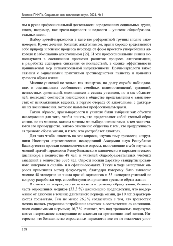 На основе результатов социологических опросов исследуется тема трезвого образа жизни. Методами стандартизированного и свободного интервью в фокус-группах было выявлено мнение врачей-наркологов и учителей общеобразовательных школ о том, что представляет собой трезвость, каковы мотивы ее выбора, положительные эффекты, каково отношение общества к тем, кто придерживается трезвого образа жизни и к тем, кто употребляет алкоголь. В ходе исследования определено, что трезвость не является для респондентов абсолютной категорией, и в ее понятие включается умеренное потребление алкоголя в соответствии с общепринятыми нормами. Мотивационная сторона выбора трезвости у здоровых людей связана с такими ценностями, как здоровье, семейное благополучие и религиозные нормы. У ранее зависимых от алкоголя лиц мотивация определяется позитивными или негативными примерами из ближнего окружения, способами проведения досуга, исключающими спиртное, и сохранением значимых отношений с близкими. Положительные эффекты выбора трезвого образа жизни в целом, по мнению респондентов, характеризуются укреплением здоровья, социальной активностью и широким кругом общения. У ранее зависимых лиц здоровый и трезвый образ жизни видится в отсутствии социальной деградации и сохранении своего социального положения. Значительная часть из них считает, что эти программы результативны. С целью формирования среди населения республики трезвого образа жизни каждая группа опрошенных экспертов выделила характерные меры. Среди них - профилактическая работа с молодежью, улучшение условий труда врачей-наркологов и материально-технической базы наркологических служб, развитие сети государственных реабилитационных центров, а также предоставление условий для досуга, исключающего потребление спиртного, усиление контролирующих и запретительных мер, препятствующих росту и распространению алкоголизации населения, мотивирующие меры, способствующие внутренней потребности человека к следованию здоровому образу жизни.