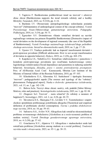 10. Клюшникова Е.А., Хромина С.И. Сущность и типология феномена “трезвость”: педагогический аспект // Наука о человеке: гуманитарные исследования. - 2021. - Т. 15, № 3. - С. 142-150. EDN: HICCRG