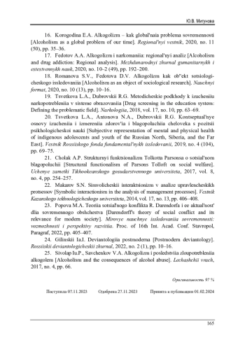 18. Романова С.В., Федотова Д.В. Алкоголизм как объект социологического исследования // Научный формат. - 2020. - № 10 (13). - С. 10-16. EDN: IKUOHU