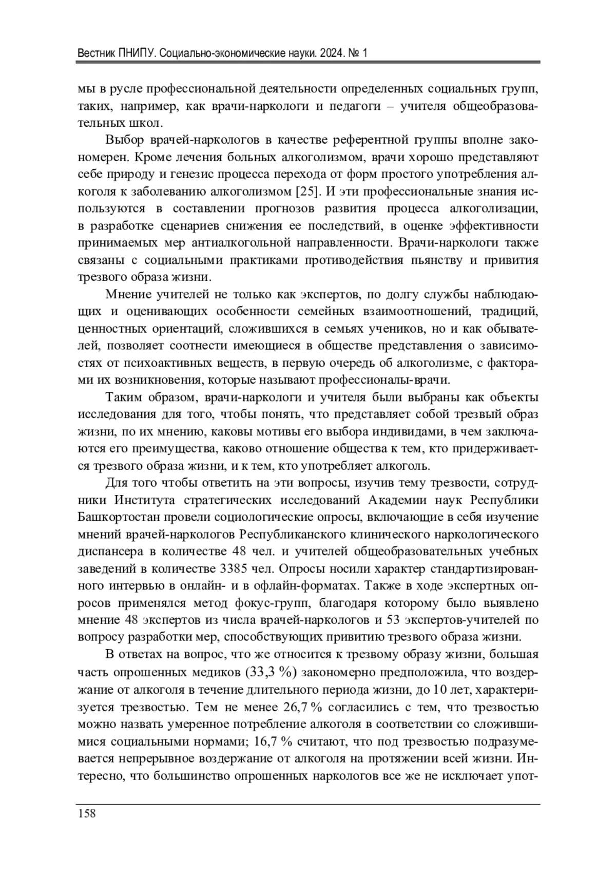 Проблематика изучения трезвости имеет выраженное социальное значение, которое прежде всего проявляется в исследовании таких социальных девиаций, как алкоголизм и наркомания [1–3]. Хотя в данном исследовании наибольший акцент сделан на понимании трезвости как на воздержании именно от алкогольных напитков
