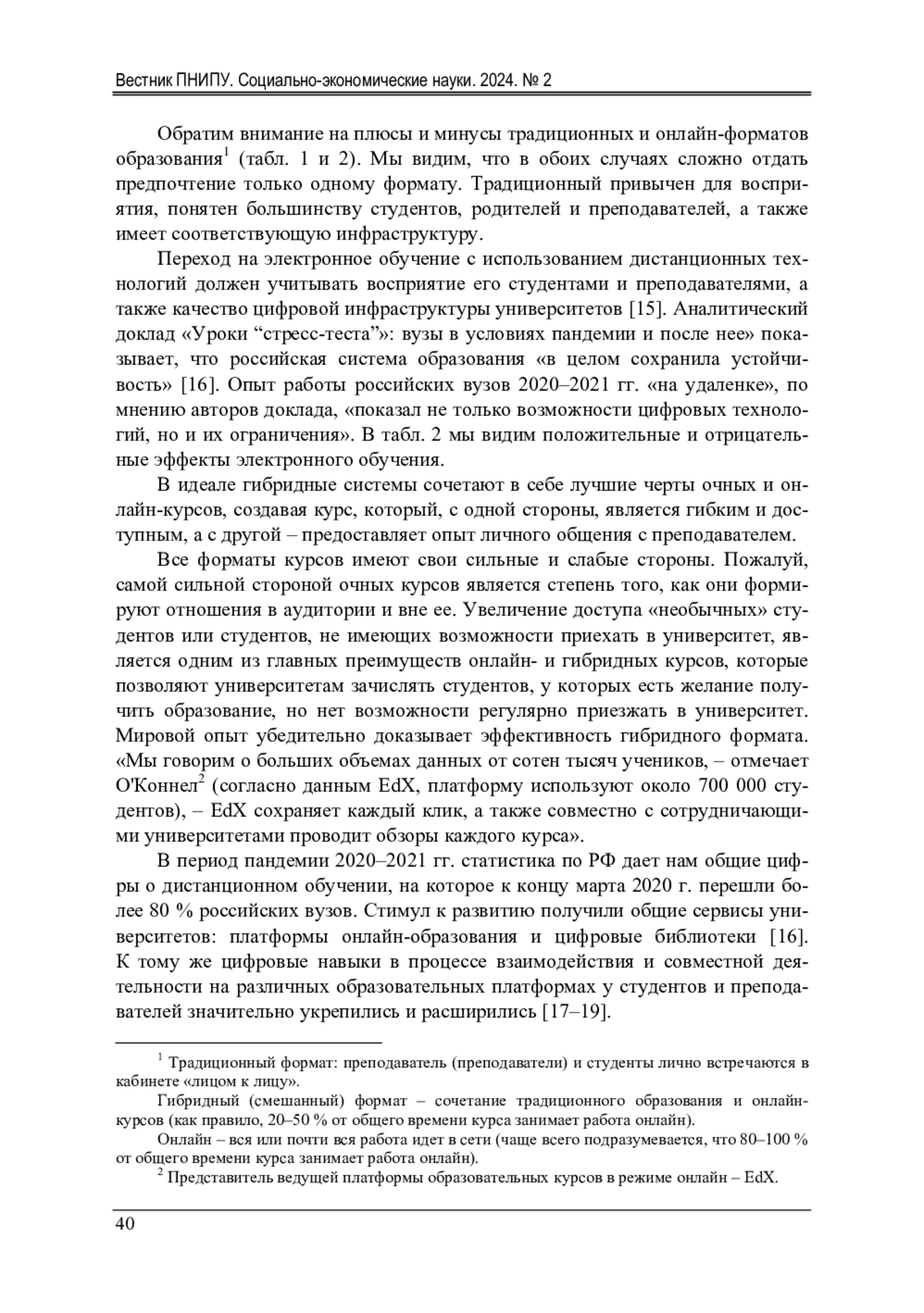 Цифровизация всех сфер жизнедеятельности общества иногда порождает неверные предположения о ее безграничных возможностях. Принято считать, что электронное образование дает хорошие результаты и требует меньше затрат. Однако практика последних лет показывает, что формат электронного образования следует рассматривать более детально, выделяя каждую цель, для реализации которой этот формат используется. Важно учитывать совокупность факторов и условий, которые могут повысить эффективность электронного образования и к числу которых можно отнести высокий уровень цифровизации всего учебного процесса, наличие институциональной рамки цифровизации образования, обеспечение оценки и самооценки базовых цифровых навыков студентов и преподавателей, готовность и умение взаимодействовать в дистанционном формате студентов и преподавателей. При таком подходе можно увидеть, что существуют ограничения его применения по уровням образования, по механизмам наработки профессиональных компетенций, по степени социально-психологического воздействия. Также следует учитывать сферу социально-трудовых отношений в части создания и ликвидации рабочих мест, напряженности и интенсивности труда, определения заработной платы и организации рабочего места. Признавая положительные результаты использования дистанционной формы электронного образования в период кризиса пандемии, нужно развивать широкую дискуссию относительно формата современного образования. Принимая во внимание несовпадение «временных горизонтов развития» системы образования и отдельного человека, отдельной организации, важно как можно более адекватно оценивать влияние на образование различного рода изменений (изменений глобального миропорядка, товарных рынков и рынка труда). В статье анализируются сильные и слабые стороны традиционного и электронного образования, обосновывается оптимальность формата «гибридного образования».