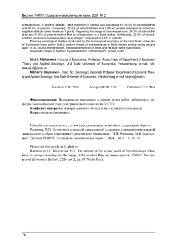 Актуальность исследования установок общества в отношении предпринимательства на современном этапе обусловлена необходимостью преодоления социокультурного кризиса и активации внутренних социальных, институциональных факторов для выхода на траекторию роста. Теоретическим фундаментом исследования служат разного рода социально-экономические концепты, а методическим инструментарием - социологические методы. Цель исследования - выявить и сопоставить образ предпринимателя в глазах общества и характеристики бизнесмена, которые способствуют/препятствуют социально-экономическому развитию. Выводы статьи базируются на результатах социологических исследований, проведенных авторами в 2017-2023 гг. среди представителей российского малого и среднего бизнеса, а также школьников, студентов экономического университета и совершеннолетнего молодого населения Свердловской области. В ходе основного исследования в 2023 г. авторами выявлено позитивное отношение школьников и родителей к занятию бизнесом, что может являться основой для формирования мотивации к становлению молодежи предпринимателями в будущем. Положительное отношение (максимальные 5 баллов) поставили 48,3 % школьников и 70,9 % родителей. При этом крайне негативное отношение (минимальный 1 балл) указали 22,6 % школьников и 9,9 % родителей. Говоря об образе бизнесмена, то 34,3 % школьников и 51,6 % родителей считают, что предприниматель - это труженик. Если говорим о бизнесмене как ловкаче, изворотливом человеке, то так считает 22,6 % школьников против 9,9 % родителей. И результаты прошлых социологических исследований социологической лаборатории УрГЭУ показали, что позитивный образ предпринимателя прочно укоренился среди молодых людей 18-30 лет, молодых предпринимателей и представителей малого и среднего бизнеса.