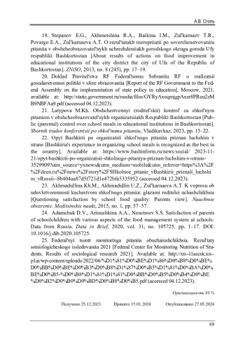 21. Латыпова, М.Х. Общественный (родительский) контроль за школьным питанием в общеобразовательных организациях Республики Башкортостан / М.Х. Латыпова // Сборник трудов конференции по школьному питанию. - Владикавказ, 2023. - С. 15-22.
