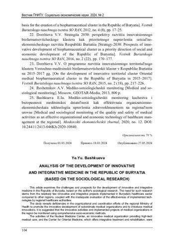 Рассмотрены проблемы и перспективы развития инновационной и интегративной медицины в Республике Бурятия, выявленные на основе проведенных автором социологических исследований. Необходимость такого исследования обусловлена малым количеством внедренных инновационных и интегративных проектов в здравоохранении Республики Бурятия по сравнению с другими регионами и недостаточной оценкой эффективности внедряемых технологий со стороны региональных органов управления здравоохранением. Выявлены изъяны организационно-методической работы регионального министерства здравоохранения по содействию инновационному развитию подведомственных медицинских организаций и внедрению медицинских инноваций. Предложено осуществлять мониторинг инновационной деятельности и реализуемых проектов медицинских организаций региона с использованием комплексных социолого-экономических методик. Дана оценка деятельности Центра ядерной медицины как медицинской организации инновационного типа, оказывающей высокотехнологичную медицинскую помощь и Центра восточной медицины как медицинской организации, оказывающей медицинскую помощь на основе интегративных методов лечения и реабилитации. Определены перспективные инновационные проекты, наиболее востребованные для регионального здравоохранения: совместный с ПАО «Сбербанк» проект «Цифровой ФАП» и система принятия врачебных решений «Электронный клинический фармаколог, апробируемая в ГАУЗ «Республиканская клиническая больница им. Н. А. Семашко». Представлена экспертная оценка внедрения инновационных технологий диагностики и лечения в ГАУЗ «Республиканская клиническая больница им. Н. А. Семашко». Сформулированы для регионального министерства здравоохранения и профильных медицинских организаций научно-практические рекомендации по внедрению инновационных и интегративных технологий в региональное здравоохранение с учетом передового мирового и российского опытов.