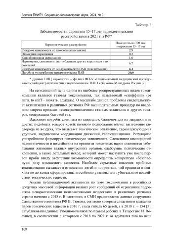 Уровень детско-подростковой заболеваемости, связанной с употреблением психоактивных веществ (ПАВ), всплеск летальных исходов, вызванных токсическими отравлениями, а также рост отдельных показателей, связанных с употреблением ненаркотических ПАВ, в Российской Федерации актуализируют анализ современного состояния проблемы токсикомании в стране. В статье представлены данные вторичного анализа материалов опросов трудоспособного городского населения РФ (2019 г., N = 1350; 2021 г., N = 1355) и студентов российских высших учебных заведений (2021 г., N = 528), проведенных сектором социологии девиантного поведения Института социологии ФНИСЦ РАН при непосредственном участии автора. Осуществлен обзор специализированных статистических данных и содержания сегмента сети интернет, посвященного изучаемой проблематике. Рассмотрены два наиболее распространенных на сегодняшний день вида токсикомании: газовая (т. н. «сниффинг») и употребление лекарственных препаратов в немедицинских целях. Произведен обзор осуществляемых мер по противодействию токсикомании. Выявлено, что наиболее остро рассматриваемая проблема стоит среди подросткового населения, что обусловлено такими факторами, как латентный характер приема токсических веществ ввиду практически полного отсутствия внешних признаков употребления; широкая доступность приобретения товаров, распространенных в использовании для достижения токсического опьянения, их относительно невысокая стоимость, а также легальный оборот.