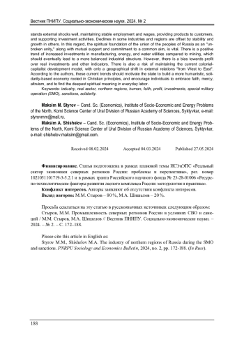 СТЫРОВ М. М., ШИШЕЛОВ М. А. ПРОМЫШЛЕННОСТЬ СЕВЕРНЫХ РЕГИОНОВ РОССИИ В УСЛОВИЯХ СВО И САНКЦИЙ // ВЕСТНИК ПЕРМСКОГО НАЦИОНАЛЬНОГО ИССЛЕДОВАТЕЛЬСКОГО ПОЛИТЕХНИЧЕСКОГО УНИВЕРСИТЕТА. СОЦИАЛЬНО-ЭКОНОМИЧЕСКИЕ НАУКИ. 2024. № 2