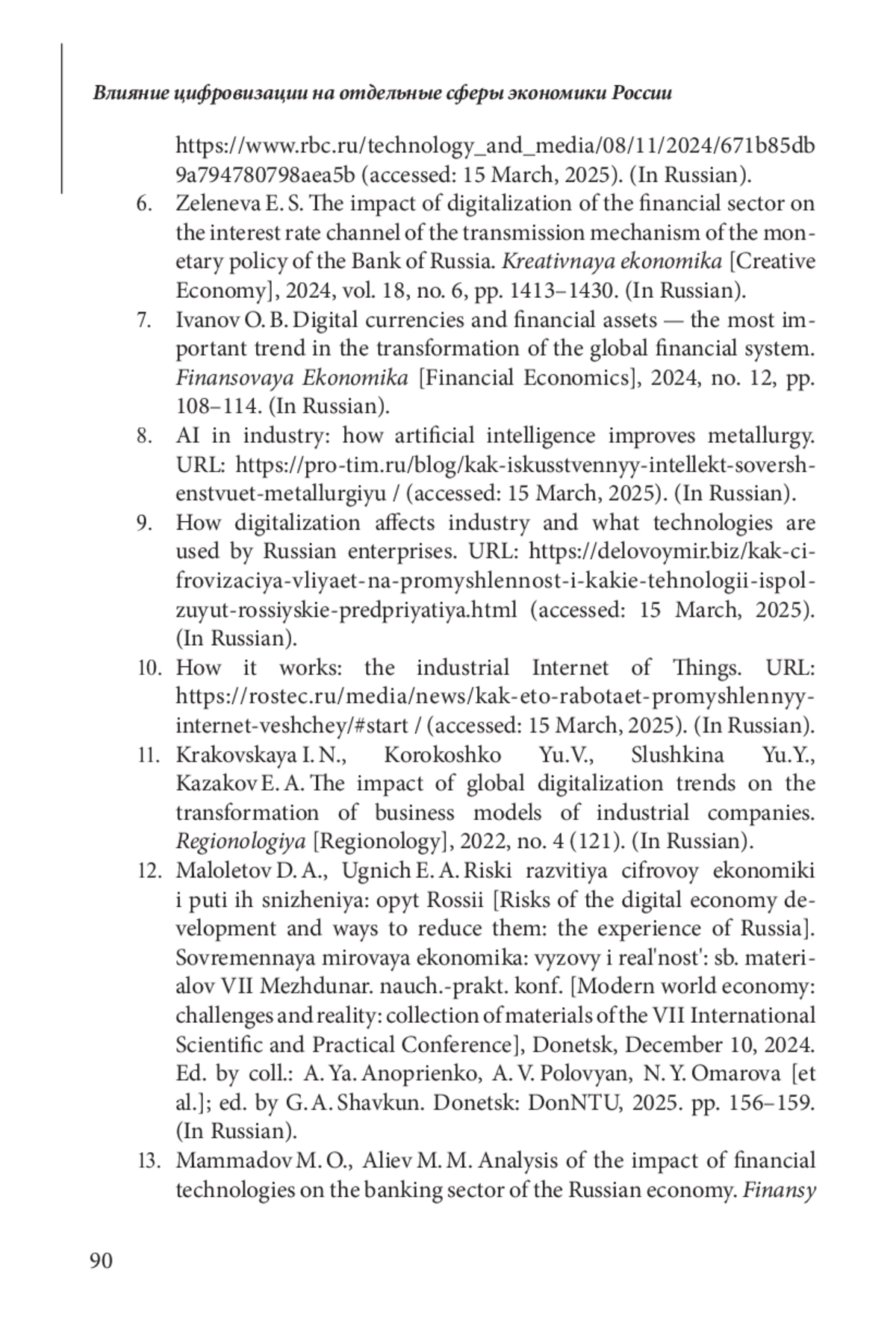6. Зеленева Е. С. Влияние цифровизации финансовой сферы на процентный канал трансмиссионного механизма денежно-кредитной политики Банка России // Креативная экономика. 2024. Том 18, № 6. С. 1413-1430.