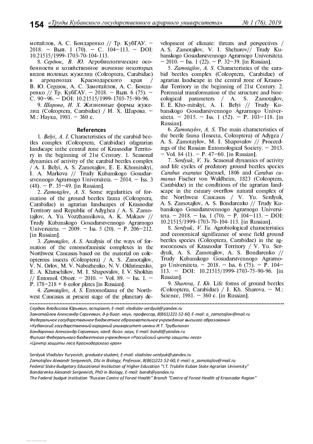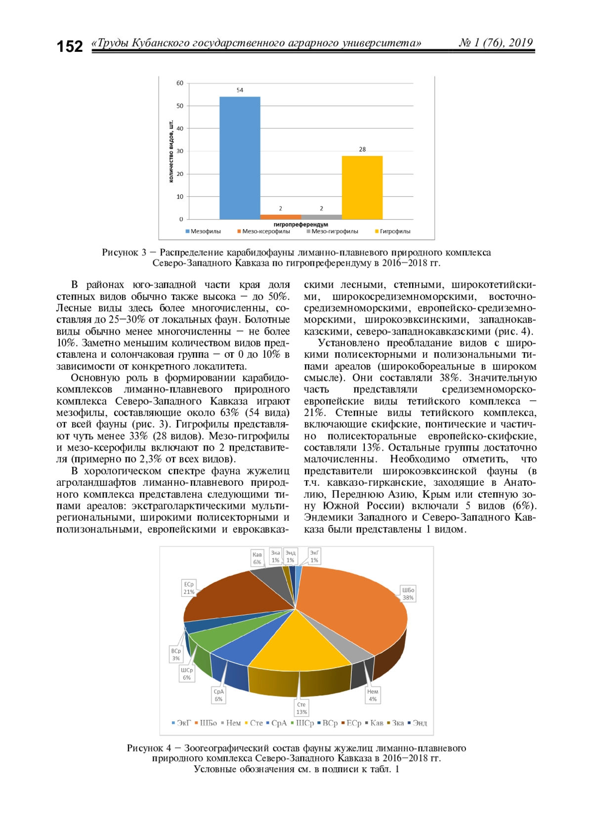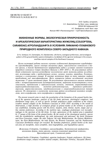 Статья: Жизненные формы, экологическая приуроченность и ареалогическая характеристика жужелиц (Coleoptera, Carabidae) агроландшафта в условиях лиманно-плавневого природного комплекса северо-Западного Кавказа (2019)
