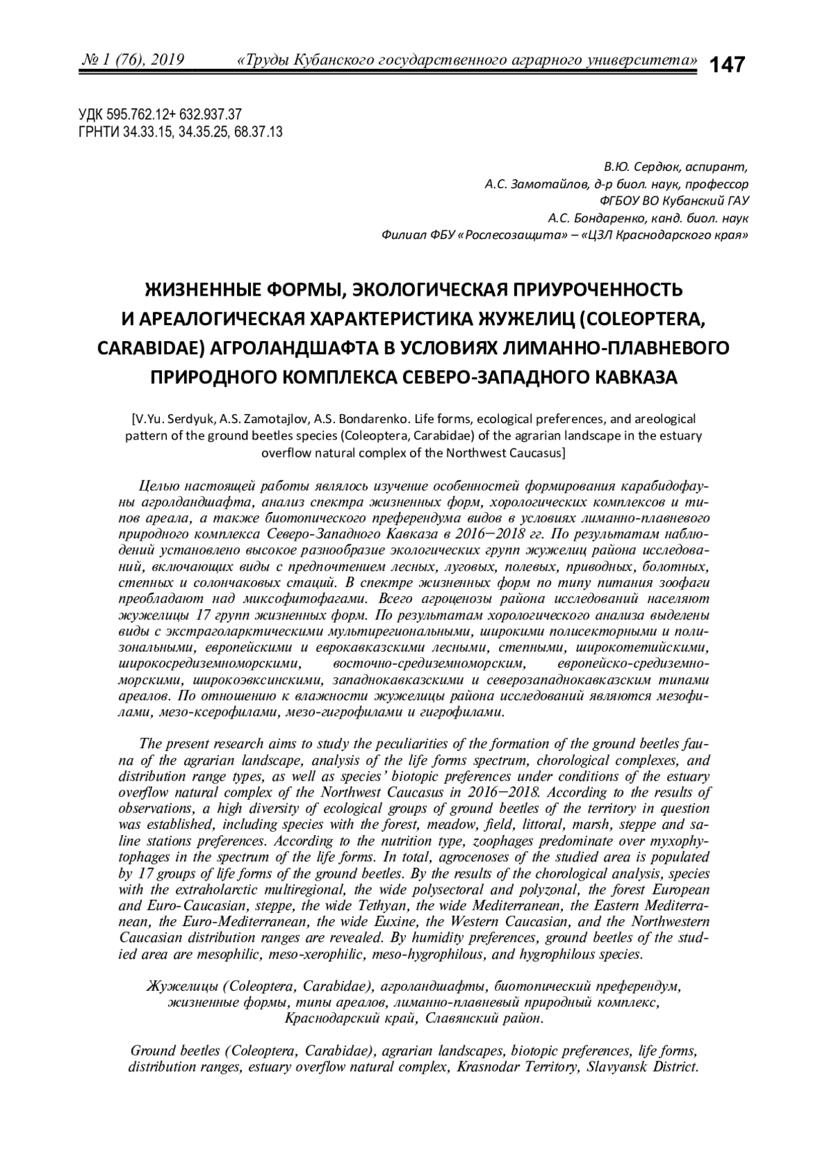 СЕРДЮК В. Ю., ЗАМОТАЙЛОВ А. С., БОНДАРЕНКО А. С. ЖИЗНЕННЫЕ ФОРМЫ, ЭКОЛОГИЧЕСКАЯ ПРИУРОЧЕННОСТЬ И АРЕАЛОГИЧЕСКАЯ ХАРАКТЕРИСТИКА ЖУЖЕЛИЦ (COLEOPTERA, CARABIDAE) АГРОЛАНДШАФТА В УСЛОВИЯХ ЛИМАННО-ПЛАВНЕВОГО ПРИРОДНОГО КОМПЛЕКСА СЕВЕРО-ЗАПАДНОГО КАВКАЗА
