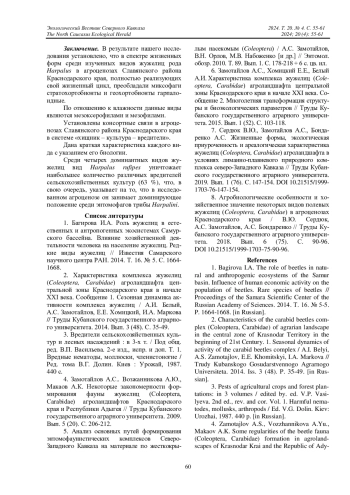 Ключевые фразы: жужелицы, Carabidae, агроландшафты, консортные связи, вредители сельскохозяйственных культур, славянский район, Краснодарский край