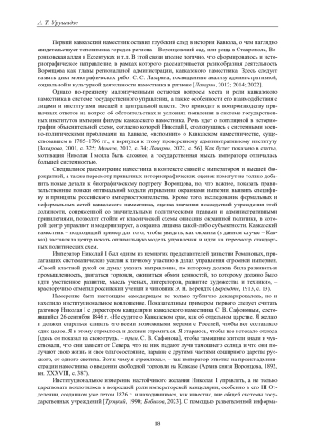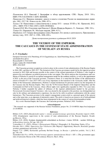 История назначения Михаила Семеновича Воронцова на должность кавказского наместника в конце 1844 г. и его последующая деятельность на южной окраине империи широко представлены в современной историографии. Можно выделить два историографических направления, в контексте которых раскрыта эта тема: биографическую литературу и региональную историю. Среди воронцовских биографий выделим работу О. Ю. Захаровой и В. А. Удовика [Захарова, 2001; Удовик, 2004], которые являются наиболее фундаментальными жизнеописаниями известного российского полководца и государственного деятеля. Воронцовская декада на Кавказе (18441854) в данных работах не является основным сюжетом и рассмотрена наряду с другими эпизодами насыщенной биографии Воронцова, а именно участием в Отечественной войне 1812 г., управлением Новороссией и Бессарабией, отношениями с А. С. Пушкиным.