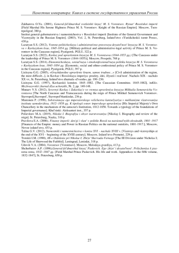 26. Лазарян С.С. Военно-политическая и административно-правовая деятельность князя М.С. Воронцова в Кавказском крае, 1845-1854 гг. Пятигорск: ПГЛУ, 2012. 322 с. ISBN: 978-5-4220-0329-7 EDN: QPXJCJ