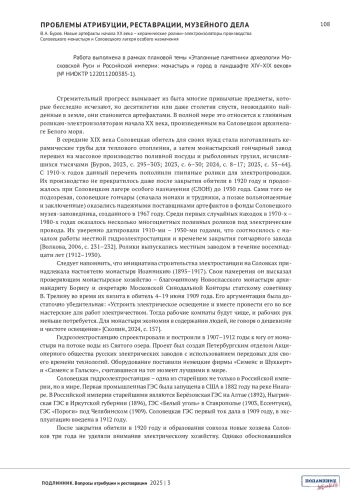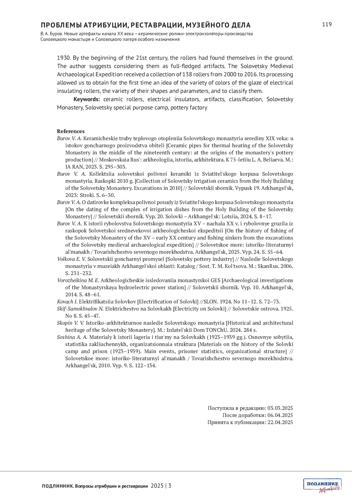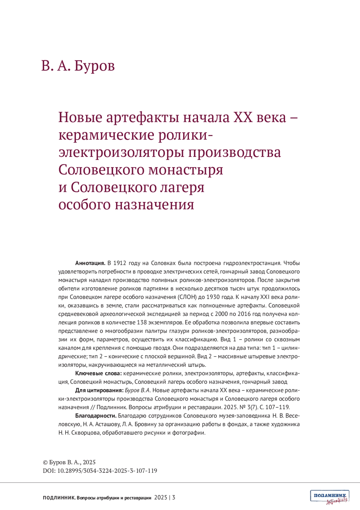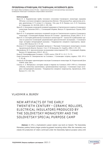 БУРОВ В.А. НОВЫЕ АРТЕФАКТЫ НАЧАЛА ХХ ВЕКА - КЕРАМИЧЕСКИЕ РОЛИКИ-ЭЛЕКТРОИЗОЛЯТОРЫ ПРОИЗВОДСТВА СОЛОВЕЦКОГО МОНАСТЫРЯ И СОЛОВЕЦКОГО ЛАГЕРЯ ОСОБОГО НАЗНАЧЕНИЯ // ПОДЛИННИК. ВОПРОСЫ АТРИБУЦИИ И РЕСТАВРАЦИИ. 2025. № 3 (7)