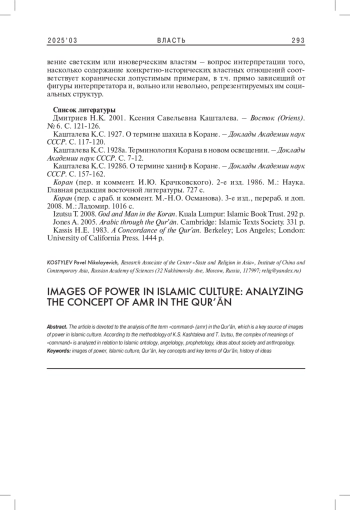 Статья посвящена анализу термина «повеления» (amr) в Коране - ключевого источника образов власти в исламской культуре. В духе методологии К. С. Кашталевой и Т. Изуцу проанализирован комплекс значений «повеления» относительно исламской онтологии, ангелологии, профетологии, представлений об обществе и антропологии.