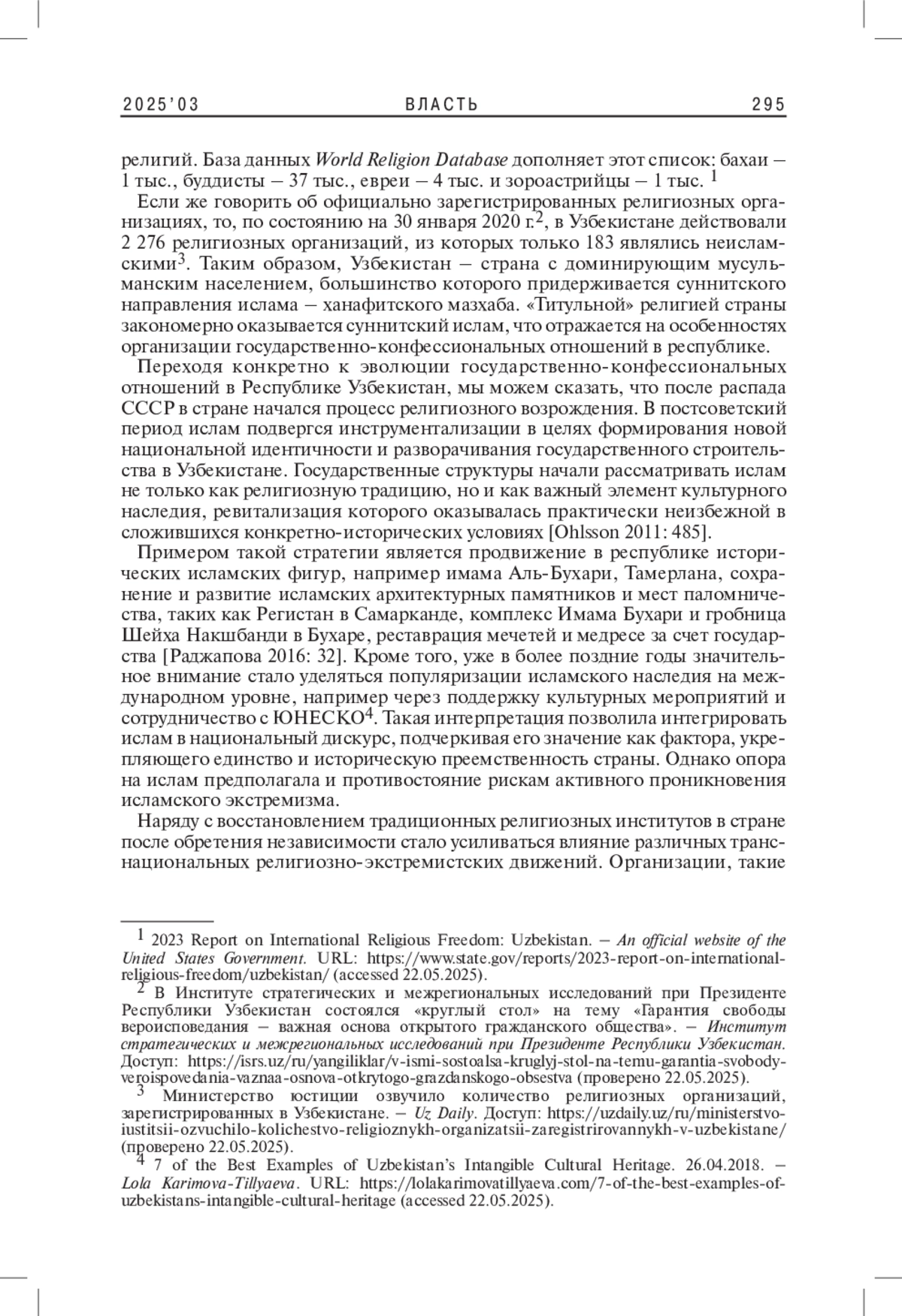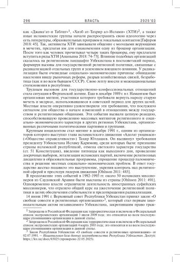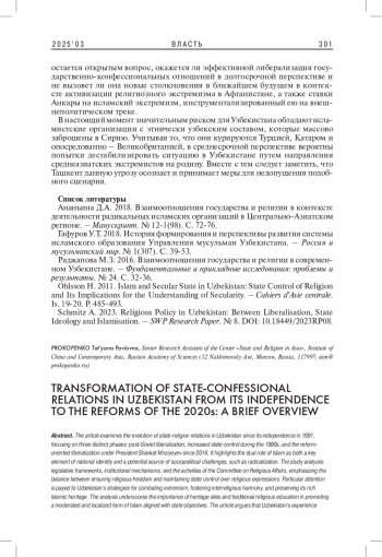 ПРОКОПЕНКО Т. П. ТРАНСФОРМАЦИЯ ГОСУДАРСТВЕННО-КОНФЕССИОНАЛЬНЫХ ОТНОШЕНИЙ В УЗБЕКИСТАНЕ ОТ ОБРЕТЕНИЯ НЕЗАВИСИМОСТИ ДО РЕФОРМ 2020-Х ГГ.: КРАТКИЙ ОБЗОР // ВЛАСТЬ. 2025. ТОМ 33 № 3