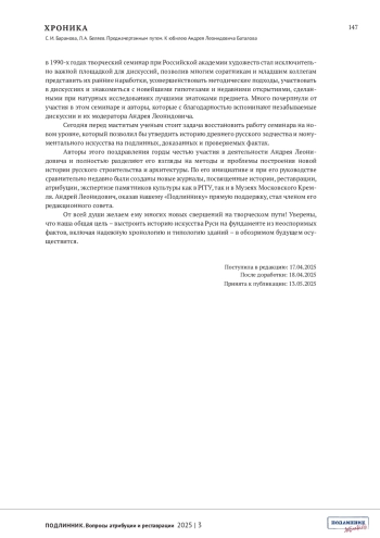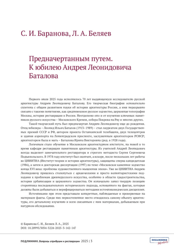 Первого июля 2025 года исполнилось 70 лет выдающемуся исследователю русской архитектуры Андрею Леонидовичу Баталову. Его творческая биография основательно сплетена с общим развитием науки об истории архитектуры России, а имя неразрывно связано с такими понятиями, как средневековое русское зодчество, церковная топография Москвы, история реставрации в России. Неотделимо оно и от изучения ключевых памятников русского искусства – Московского Кремля, собора Покрова на Рву и многих других.