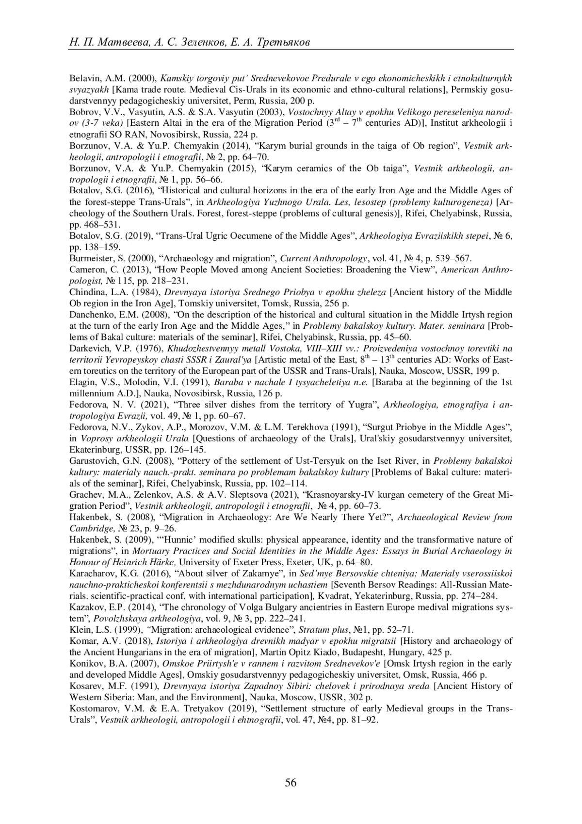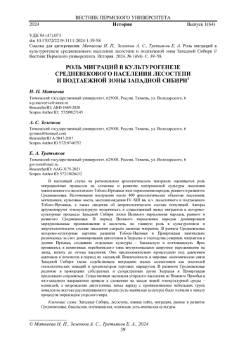 40. Матвеева Н. П., Третьяков Е.А., Зеленков А.С. Свидетельства миграции группы южно-таежного населения Западной Сибири на Урал в раннем Средневековье (могильник Воденниково-1) // Археология, этнография и антропология Евразии. 2021. Т. 49, № 4. С. 91-99. DOI: 10.17746/1563-0102.2021.49.4.091-099 EDN: TFOESG