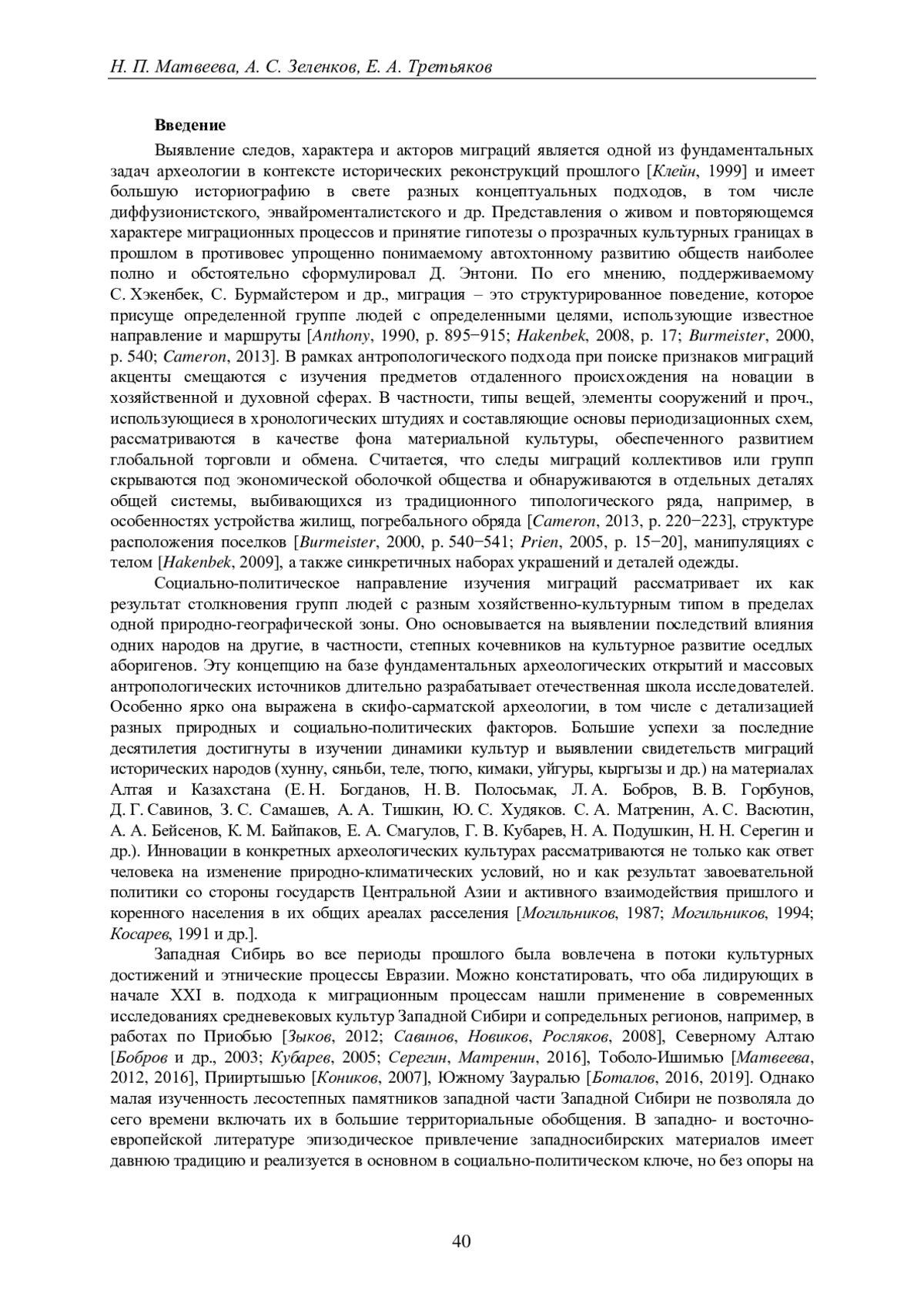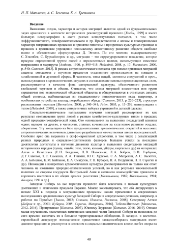 Выявление следов, характера и акторов миграций является одной из фундаментальных задач археологии в контексте исторических реконструкций прошлого [Клейн, 1999] и имеет большую историографию в свете разных концептуальных подходов, в том числе диффузионистского, энвайроменталистского и др. Представления о живом и повторяющемся характере миграционных процессов и принятие гипотезы о прозрачных культурных границах в прошлом в противовес упрощенно понимаемому автохтонному развитию обществ наиболее полно и обстоятельно сформулировал Д. Энтони.