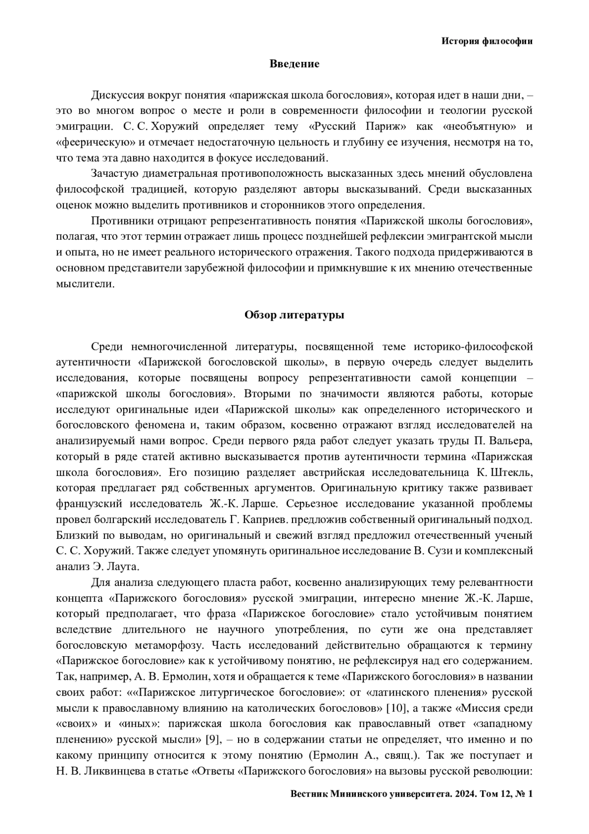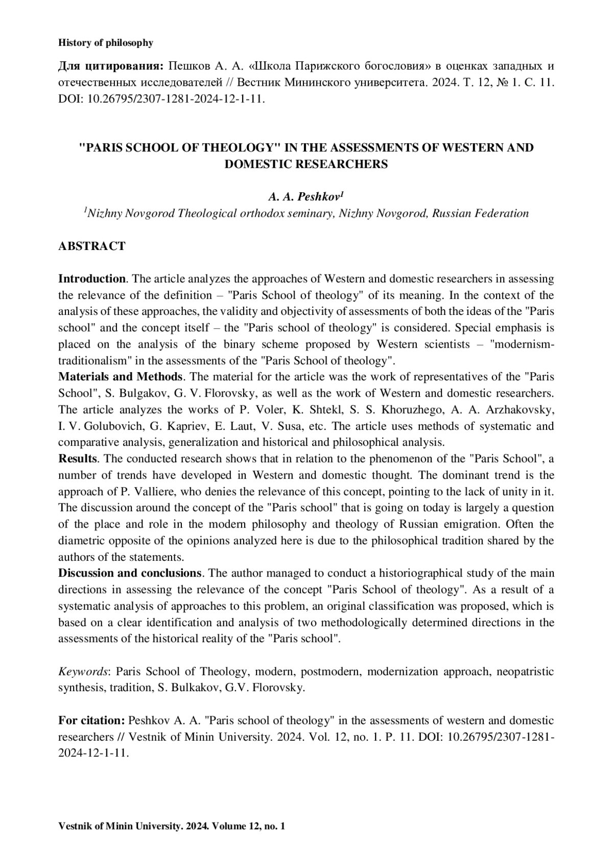Введение. В статье анализируются подходы западных и отечественных исследователей в оценках релевантности определения – «школа Парижского богословия». В контексте анализа этих подходов рассматривается правомочность и объективность оценок как идей «парижской школы», так и самого концепта «школа Парижского богословия». Особый акцент делается на анализе предложенной западными учеными бинарной схемы «модернизм-традиционализм» в оценках «Парижской школы богословия».