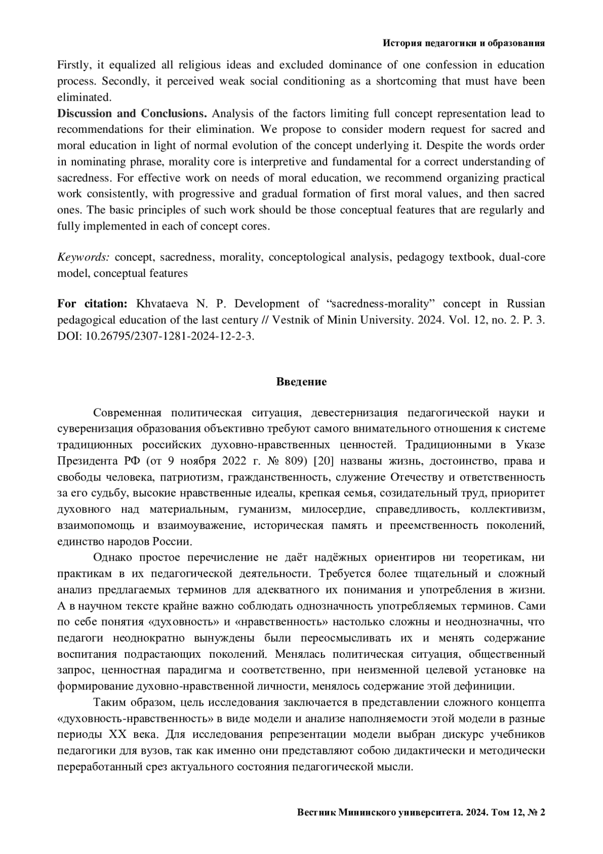 ХВАТАЕВА Н. П. РАЗВИТИЕ КОНЦЕПТА «ДУХОВНОСТЬ-НРАВСТВЕННОСТЬ» В ОТЕЧЕСТВЕННОМ ПЕДАГОГИЧЕСКОМ ОБРАЗОВАНИИ ПОСЛЕДНЕГО СТОЛЕТИЯ // ВЕСТНИК МИНИНСКОГО УНИВЕРСИТЕТА. 2024. ТОМ 12, № 2