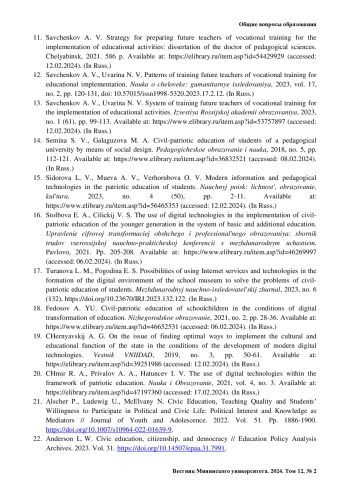 13. Савченков А. В., Уварина Н. В. Система подготовки будущих педагогов профессионального обучения к осуществлению воспитательной деятельности // Известия Российской академии образования. 2023. № 1 (61). С. 99-113. URL: https://www.elibrary.ru/item.asp?id=53757897 (дата обращения: 12.02.2024).