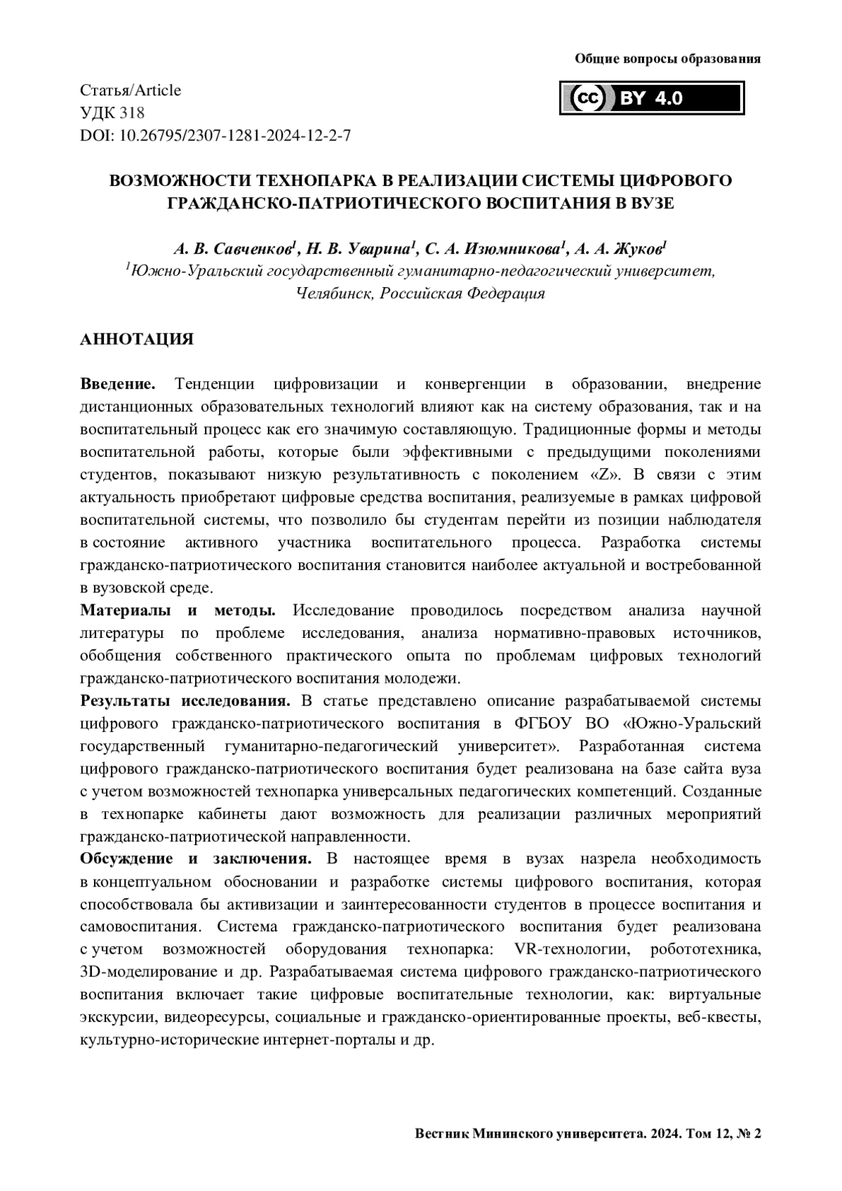 Результаты исследования. В статье представлено описание разрабатываемой системы цифрового гражданско-патриотического воспитания в ФГБОУ ВО «Южно-Уральский государственный гуманитарно-педагогический университет». Разработанная система цифрового гражданско-патриотического воспитания будет реализована на базе сайта вуза с учетом возможностей технопарка универсальных педагогических компетенций. Созданные в технопарке кабинеты дают возможность для реализации различных мероприятий гражданско-патриотической направленности.