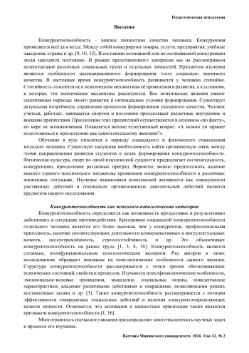 Обсуждение и заключения. Обсуждаются факторы и условия, влияющие на процесс формирования конкурентоспособности. В ранее проведённых собственных научных исследованиях установлен базовый признак конкурентоспособности. Указанный процесс анализируется с позиции теории поэтапного формирования умственных действий и понятий (Гальперин П. Я.), а также уровней управления движениями (Бернштейн Н. А.). Представленный материал является теоретическим основанием создания методики целенаправленного формирования конкурентоспособности у студенческой молодёжи.