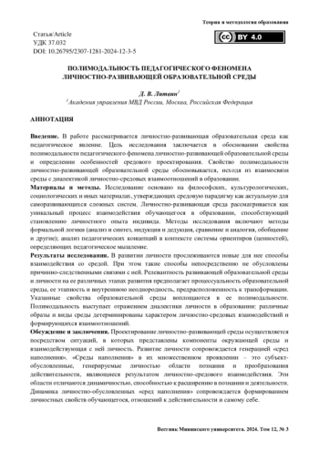 Статья: Полимодальность педагогического феномена личностно-развивающей образовательной среды (2024)