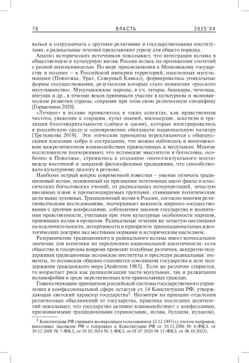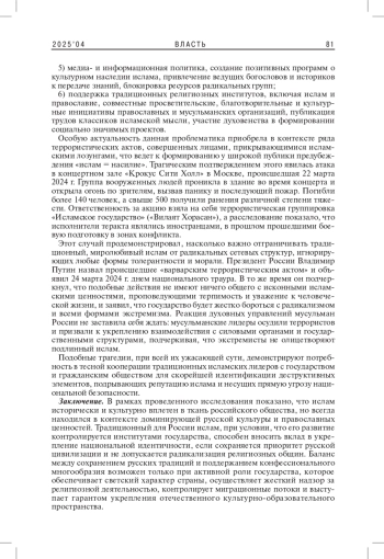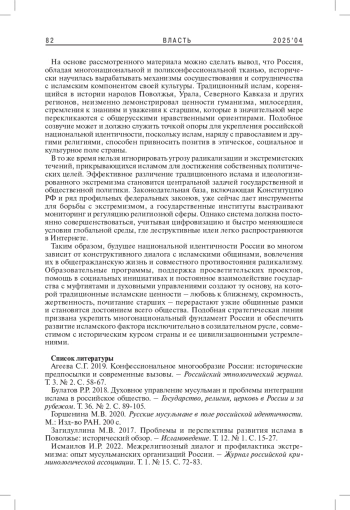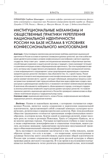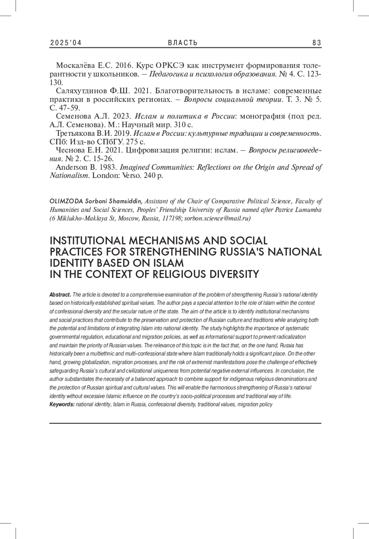 ОЛИМЗОДА С. Ш. ИНСТИТУЦИОНАЛЬНЫЕ МЕХАНИЗМЫ И ОБЩЕСТВЕННЫЕ ПРАКТИКИ УКРЕПЛЕНИЯ НАЦИОНАЛЬНОЙ ИДЕНТИЧНОСТИ РОССИИ НА БАЗЕ ИСЛАМА В УСЛОВИЯХ КОНФЕССИОНАЛЬНОГО МНОГООБРАЗИЯ // ВЛАСТЬ. 2025. ТОМ 33 № 4