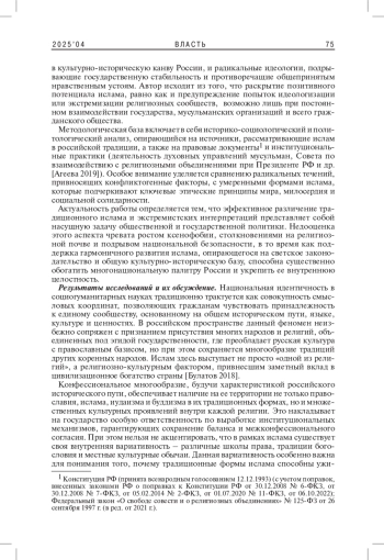 Статья: ИНСТИТУЦИОНАЛЬНЫЕ МЕХАНИЗМЫ И ОБЩЕСТВЕННЫЕ ПРАКТИКИ УКРЕПЛЕНИЯ НАЦИОНАЛЬНОЙ ИДЕНТИЧНОСТИ РОССИИ НА БАЗЕ ИСЛАМА В УСЛОВИЯХ КОНФЕССИОНАЛЬНОГО МНОГООБРАЗИЯ (2025)