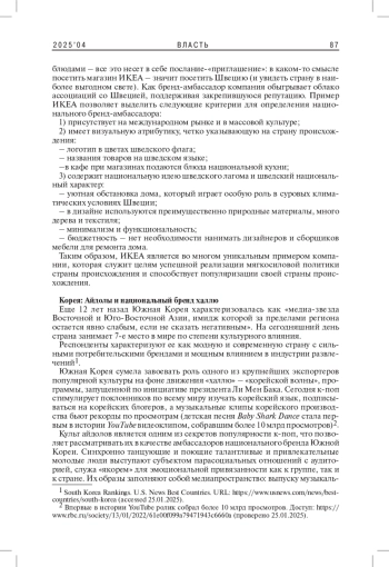 МАЛЫШКО Ю. А. БРЕНД-АМБАССАДОРЫ В СТРУКТУРЕ НАЦИОНАЛЬНЫХ БРЕНДОВ (НА ПРИМЕРЕ ШВЕЦИИ И РЕСПУБЛИКИ КОРЕЯ) // ВЛАСТЬ. 2025. ТОМ 33 № 4