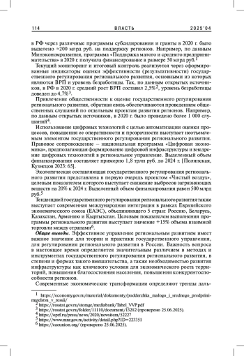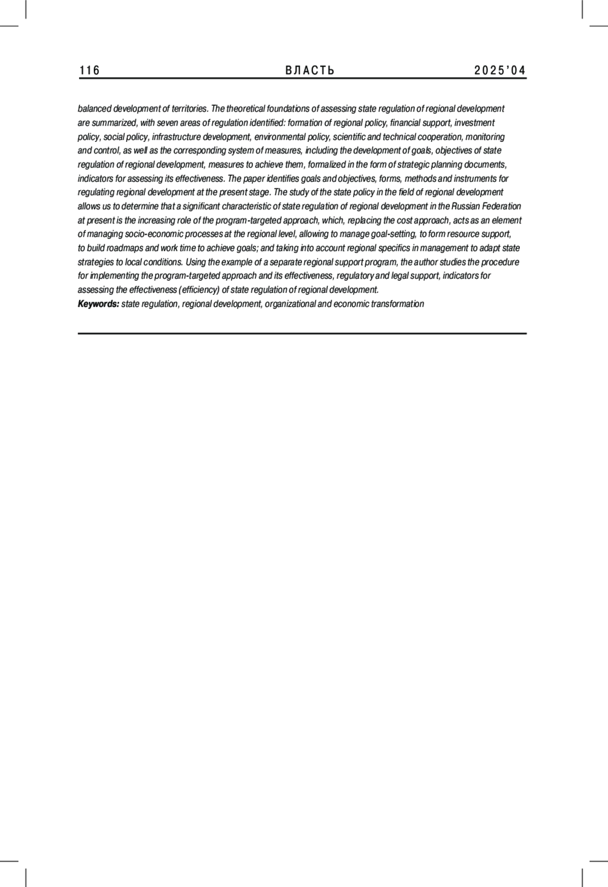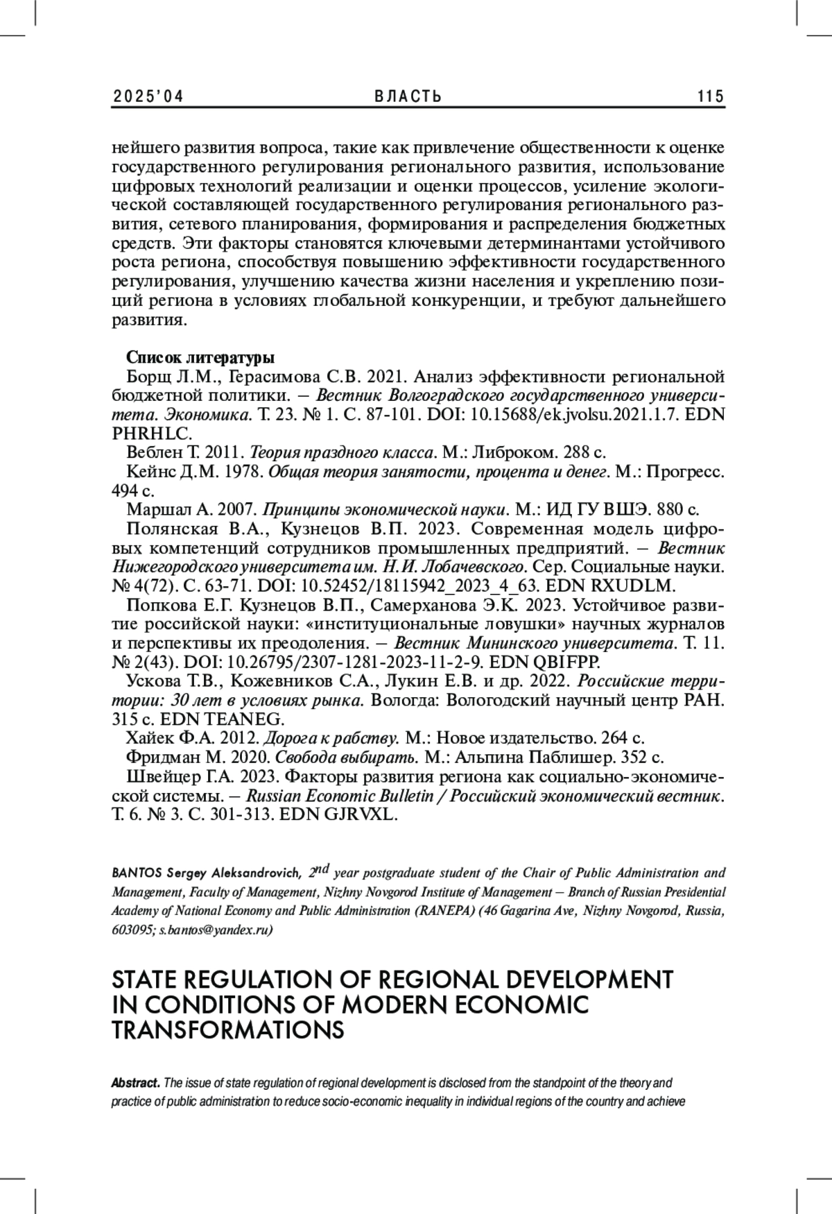 БАНТОС С. А. ГОСУДАРСТВЕННОЕ РЕГУЛИРОВАНИЕ РЕГИОНАЛЬНОГО РАЗВИТИЯ В УСЛОВИЯХ СОВРЕМЕННЫХ ЭКОНОМИЧЕСКИХ ТРАНСФОРМАЦИЙ // ВЛАСТЬ. 2025. ТОМ 33 № 4