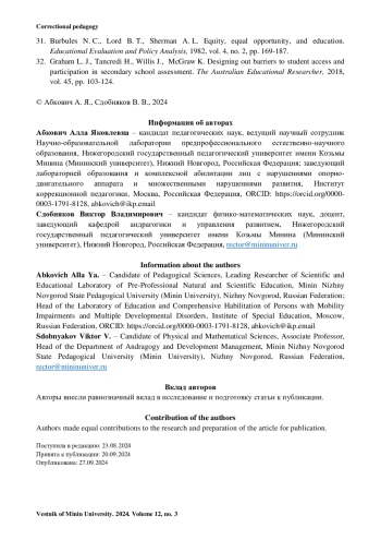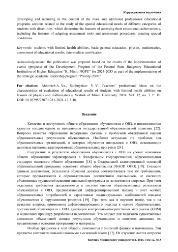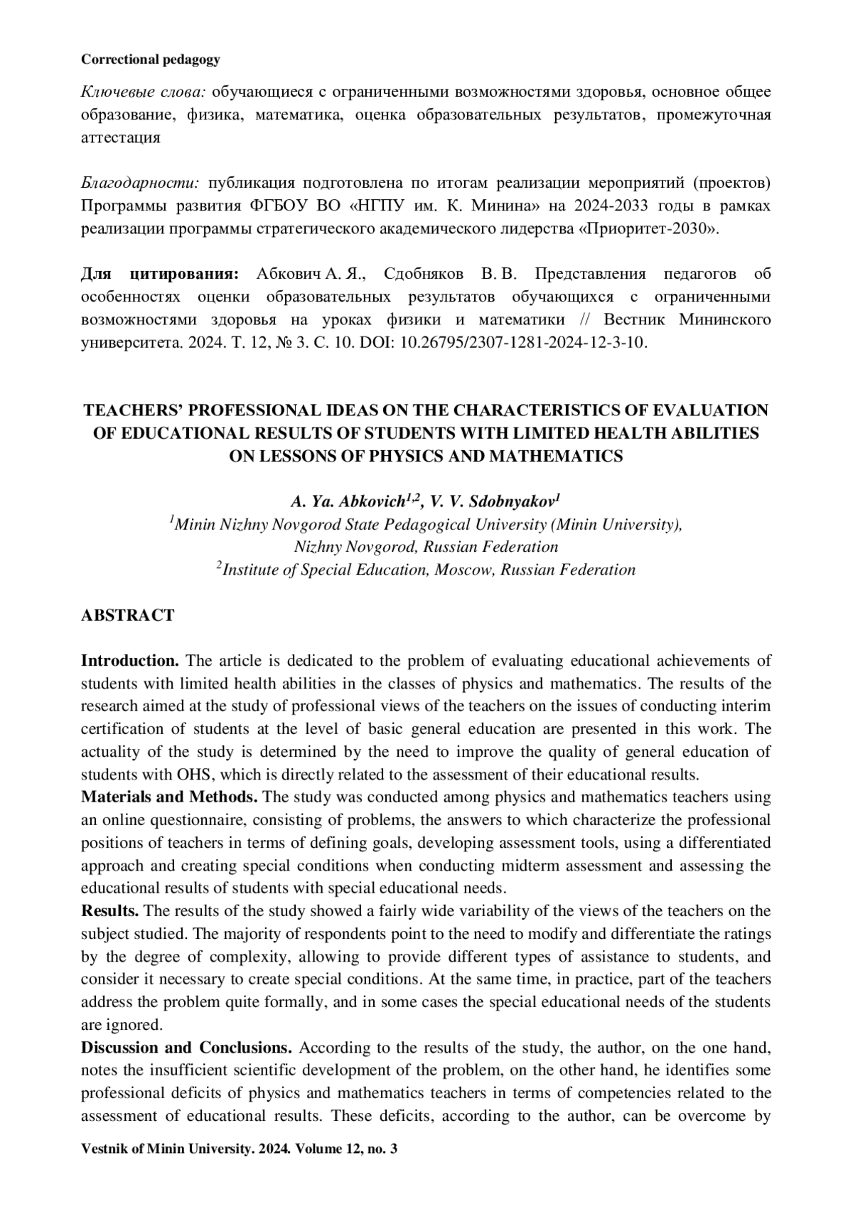АБКОВИЧ А. Я., СДОБНЯКОВ В. В. ПРЕДСТАВЛЕНИЯ ПЕДАГОГОВ ОБ ОСОБЕННОСТЯХ ОЦЕНКИ ОБРАЗОВАТЕЛЬНЫХ РЕЗУЛЬТАТОВ ОБУЧАЮЩИХСЯ С ОГРАНИЧЕННЫМИ ВОЗМОЖНОСТЯМИ ЗДОРОВЬЯ НА УРОКАХ ФИЗИКИ И МАТЕМАТИКИ // ВЕСТНИК МИНИНСКОГО УНИВЕРСИТЕТА. 2024. ТОМ 12, № 3