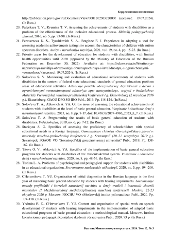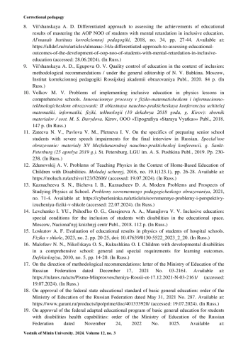 Обсуждение и заключения. По результатам исследования автор, с одной стороны, отмечает недостаточную научную разработанность проблемы, с другой – выделяет некоторые профессиональные дефициты учителей физики и математики в части компетенций, связанных с оценкой образовательных результатов. Данные дефициты, по мнению автора, могут быть преодолены за счет разработки и включения в содержание основных и дополнительных профессиональных образовательных программ разделов, связанных с изучением особых образовательных потребностей разных категорий обучающихся с ОВЗ, определяющих особенности оценки их образовательных достижений, включая особенности адаптации оценочных средств и процедуры оценивания, создания специальных условий.