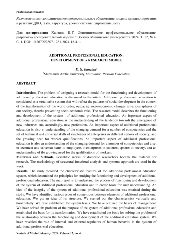 Введение. В статье рассматривается проблема проектирования исследовательской модели функционирования и развития дополнительного профессионального образования (ДПО) как устойчивой системы, которая будет отражать закономерности общественного развития в условиях трансформации мирового порядка, опережая социально-экономические изменения в различных сферах нашего общества, предупреждая тем самым социальноэкономические риски. Исследовательская модель описывает функционирование и развитие системы ДПО, важным аспектом которого является понимание наличия тенденции к появлению новых отраслей и соответственно новых профессий, изменения спроса на ряд компетенций и набора технических и универсальных навыков сотрудников предприятий разных сфер общества, роста необходимости в квалификации работников.
